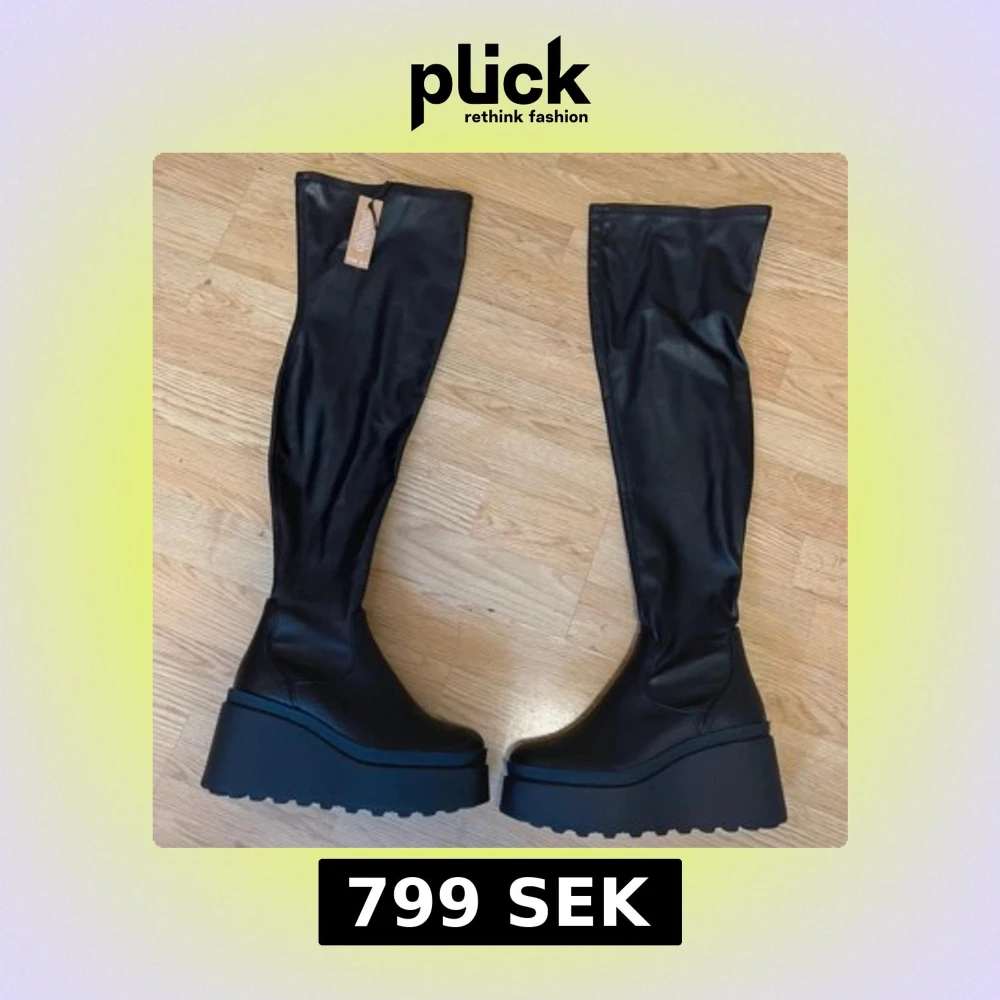 Säljer ett par svarta overknee boots med hög platåsula och rund tå. Skorna är i syntetmaterial med stretchig skaft som går över knäet. Perfekt skick, aldrig använt tyvärr! Köpta för drygt 900kr.