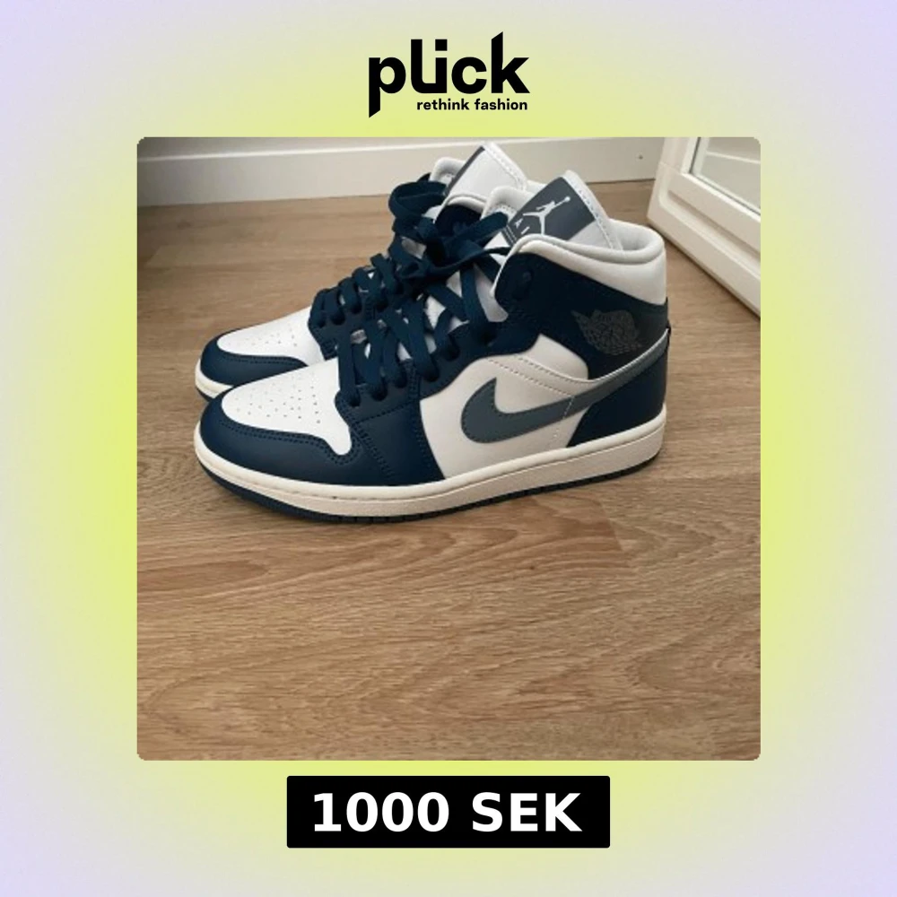 Säljer ett par Nike Air Jordan 1 Mid sneakers i marinblått och vitt med klassisk Jordan-logga på sidan och tungan. Knappt använda som de är i nyskick. Köpta från zalando, pris kan diskuteras.
