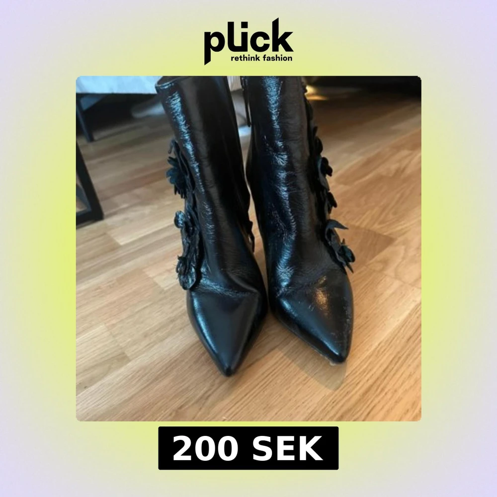 Säljer ett par svarta stövletter från Zara i äkta läder med hög klack och spetsig tå. Skorna är gjorda i glansigt skinn och har dekorativa blommor på utsidan som ger en unik och cool vibe. Dragkedja på insidan för enkel påtagning. Perfekt för dig som vill sticka ut.