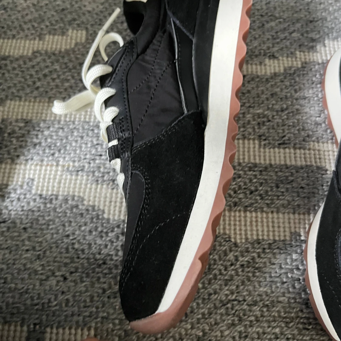 Svarta sneakers från Zara med vit platt sula och grovt mönstrad undersida i ljusbrunt. Skorna har vita snören, rund tå och detaljer i mocka och syntet. Snygg kontrast mellan svart och vitt, perfekt för dig som gillar stilrena och sportiga vibes.