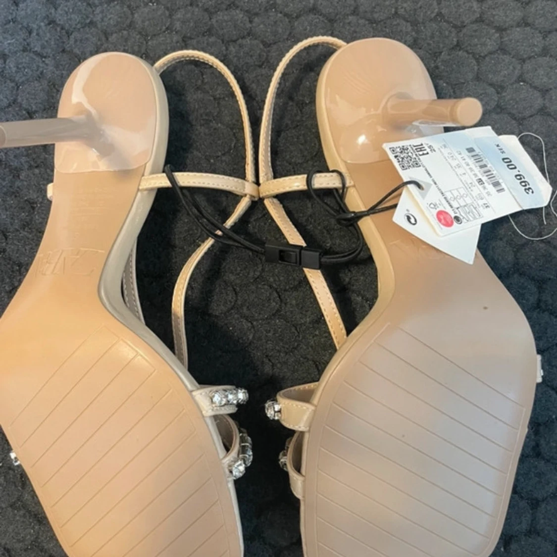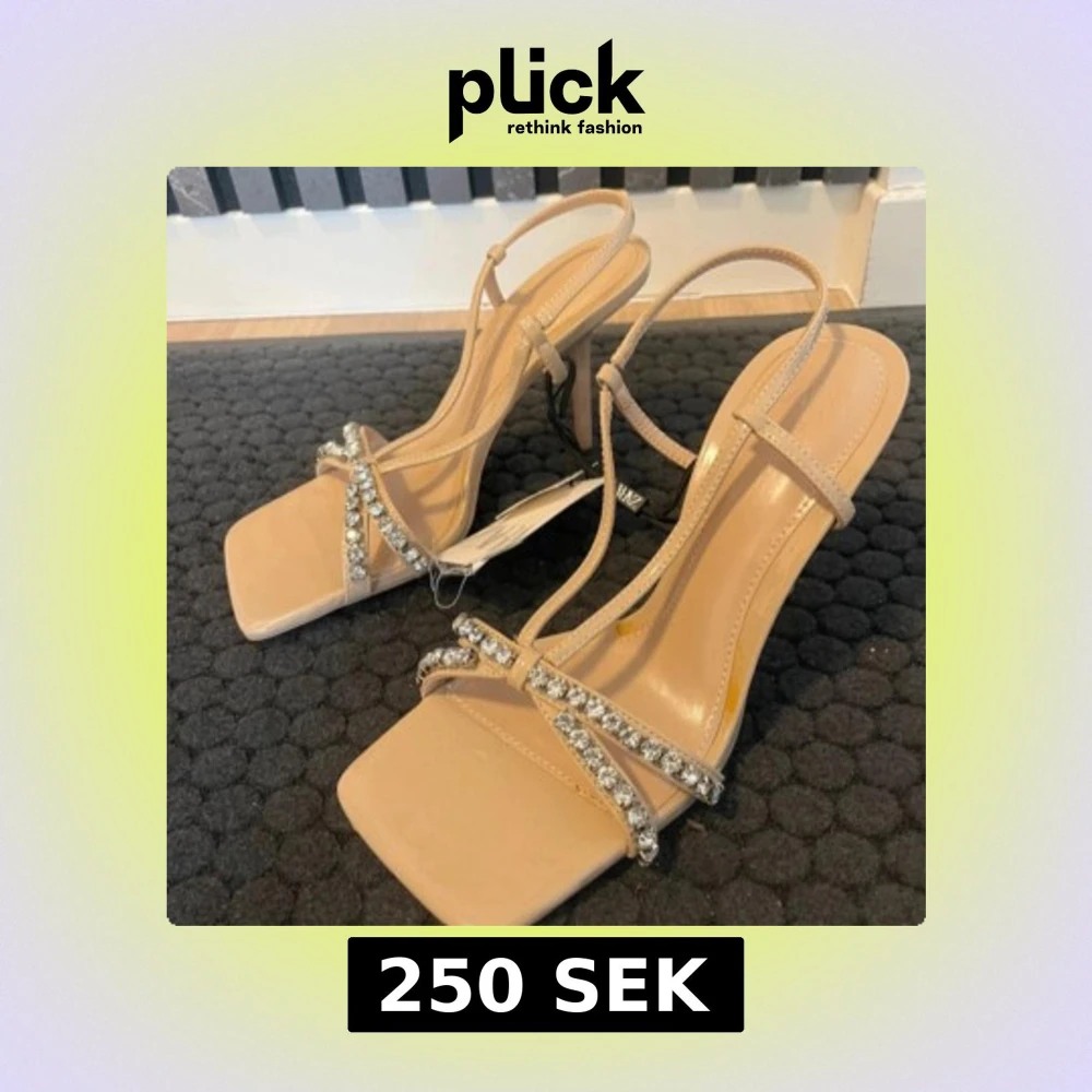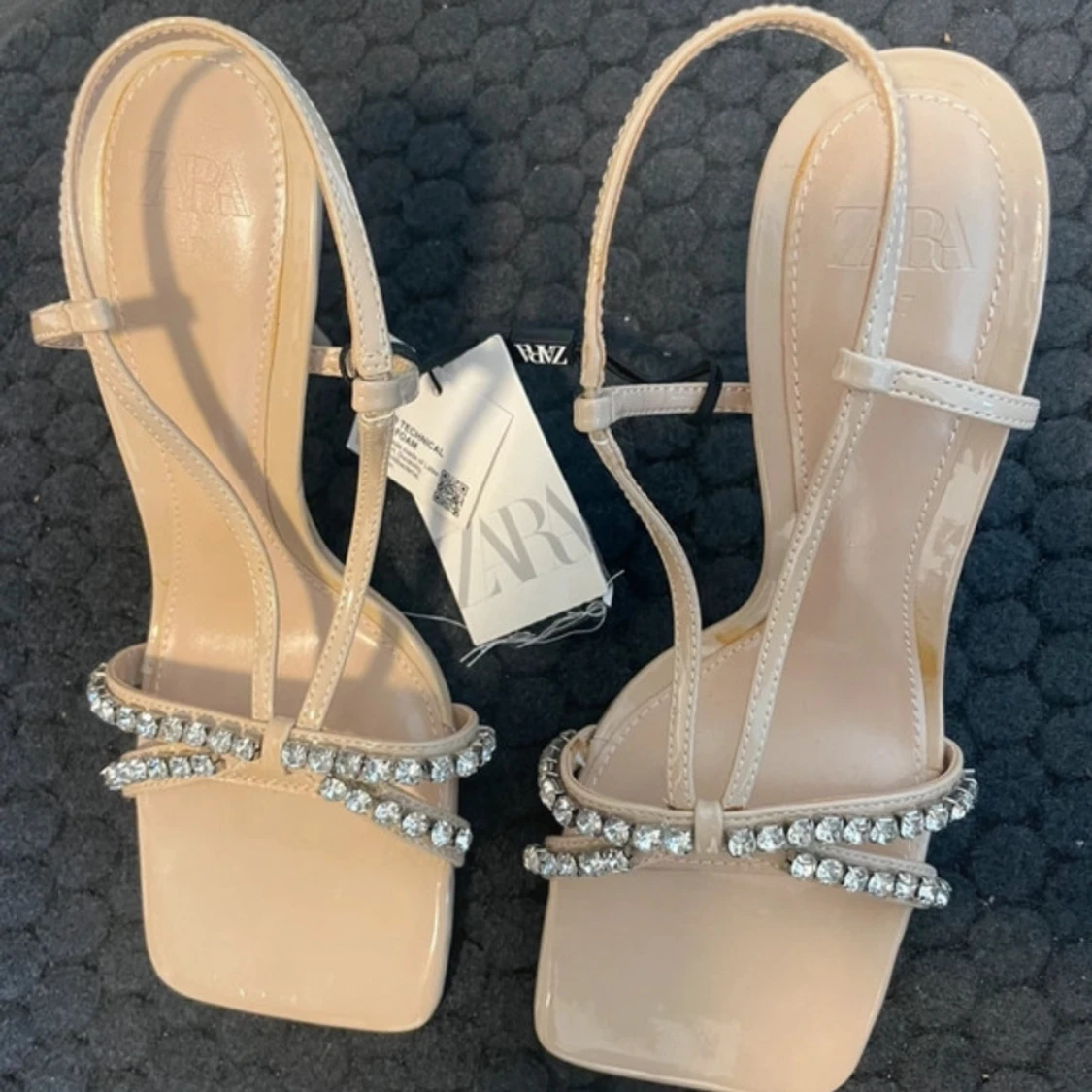 Snygga beige sandaler från Zara med smala remmar och fyrkantig tå. Skorna har hög klack och är dekorerade med glittrande strass framtill. Perfekta för dig som vill sticka ut med en elegant och trendig look.