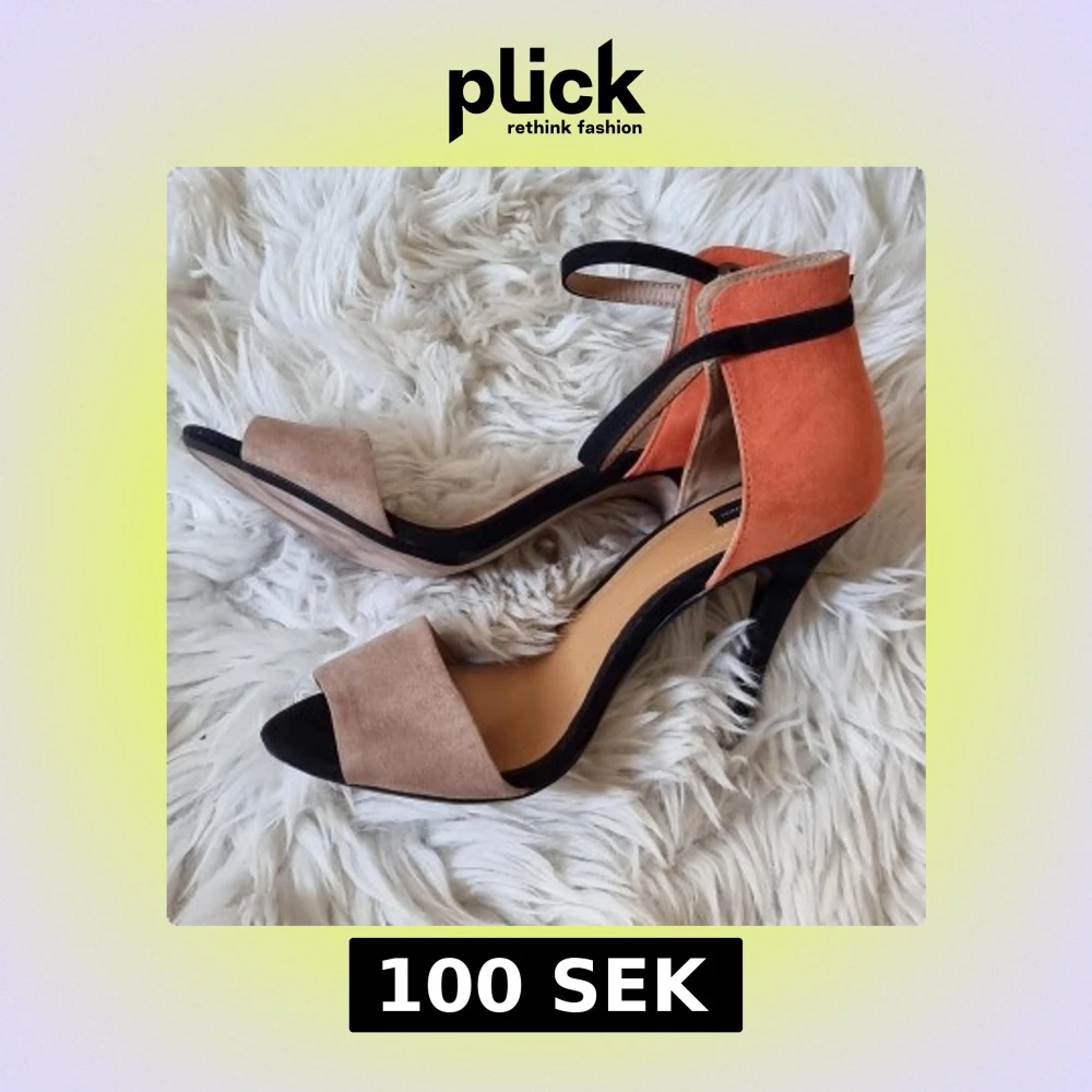 Snygga klackar från Zara Collection med öppen tå och rem runt vristen. Skorna har beige mockadetalj framtill, orange mocka vid hälen och svarta detaljer. Klackhöjd 8 cm