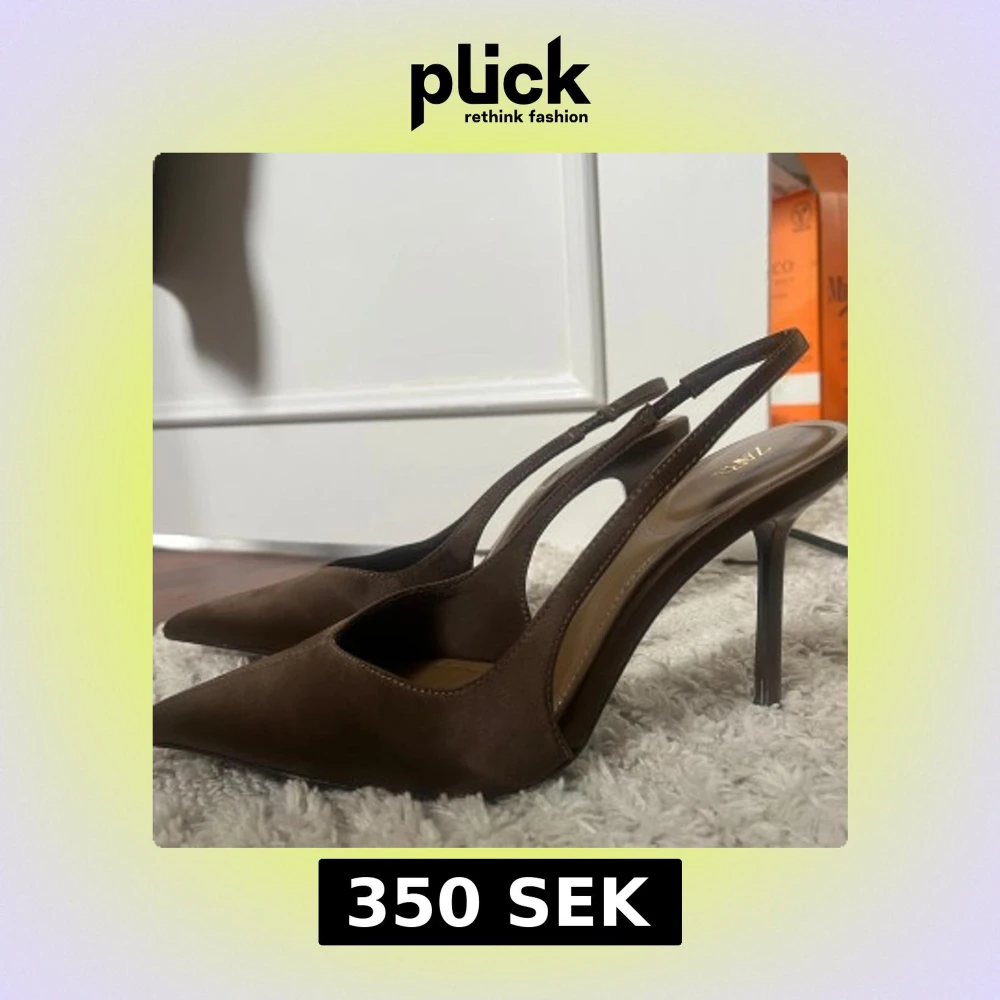 Säljer ett par snygga bruna klackar från Zara med smal klack och öppen häl. Skorna har en spetsig tå och är tillverkade i ett material som liknar mocka. Sälj då de tyvärr är förstora för mig, endast testade inomhus