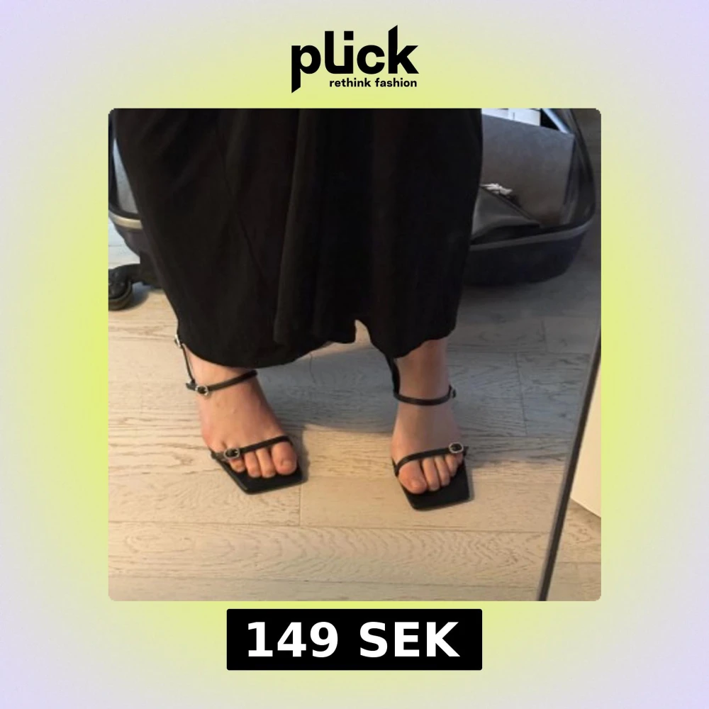 Stilrena svarta sandaler från Zara med smala remmar och fyrkantig tå. Skorna har glittrande spännen och en elegant klack. Perfekta för att lyfta din outfit med en touch av glamour.