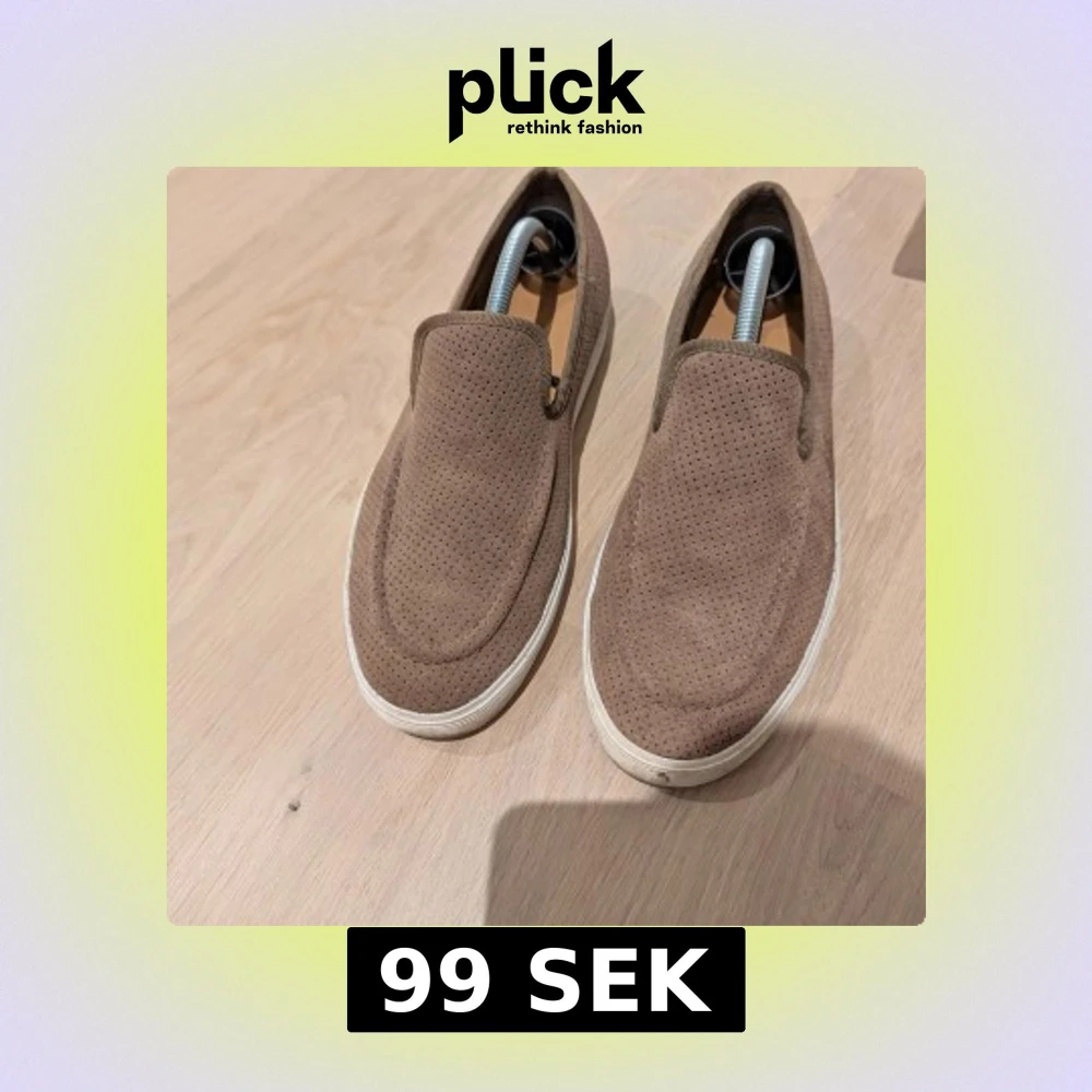 Säljer ett par bruna loafers sneakers i mocka med perforerat mönster och vit platt sula. Skorna har rund tå och är perfekta för en avslappnad stil. Enkla att ta på och av tack vare slip-on designen.