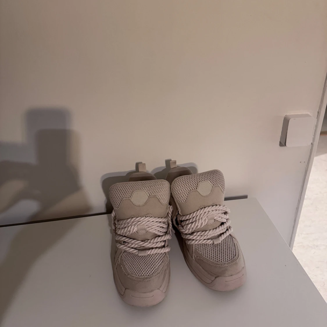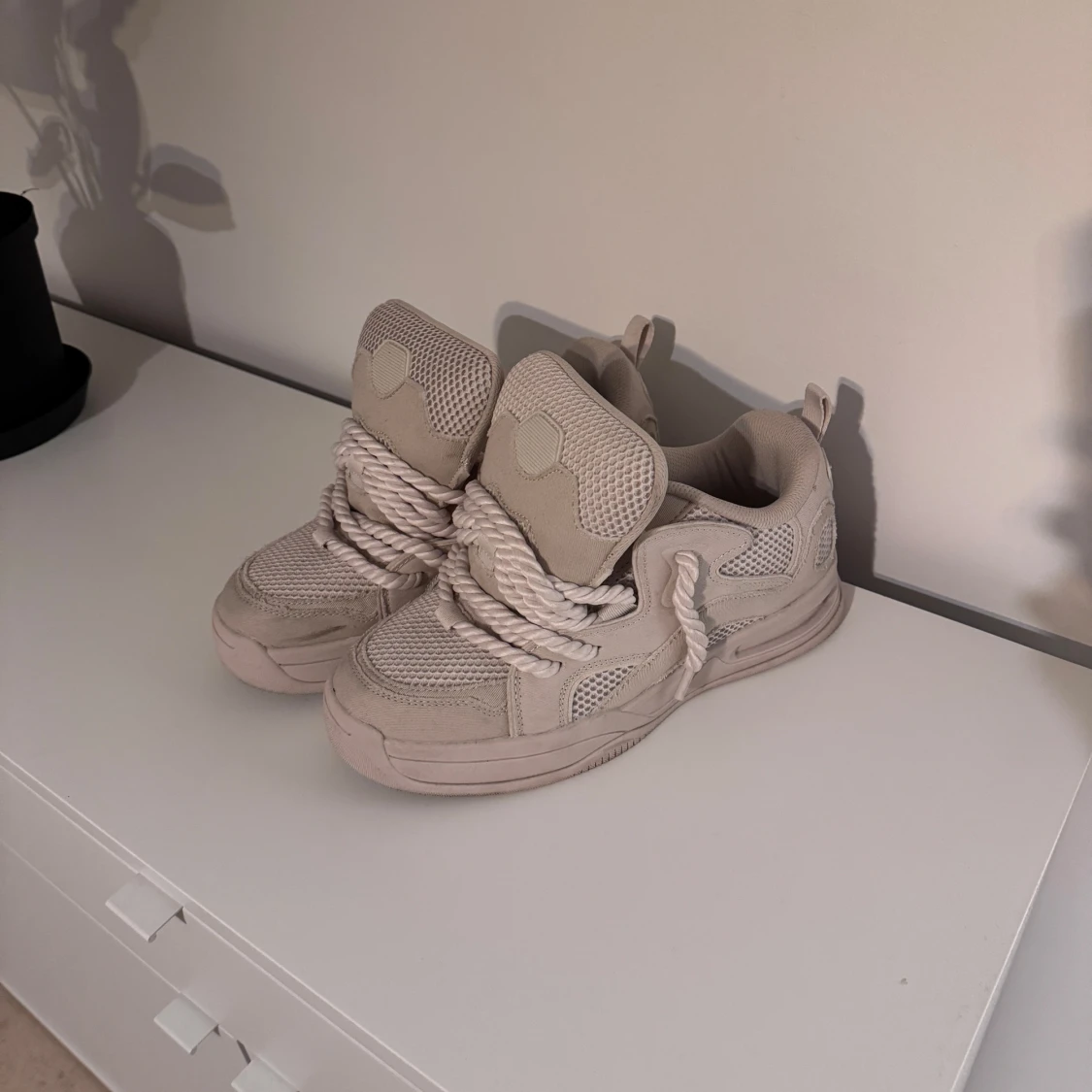 Säljer ett par beige sneakers med riktigt grova snören och meshdetaljer. Skorna har en chunky sula och rund tå, perfekt för dig som gillar streetwear och vill sticka ut lite extra. Storlek 43