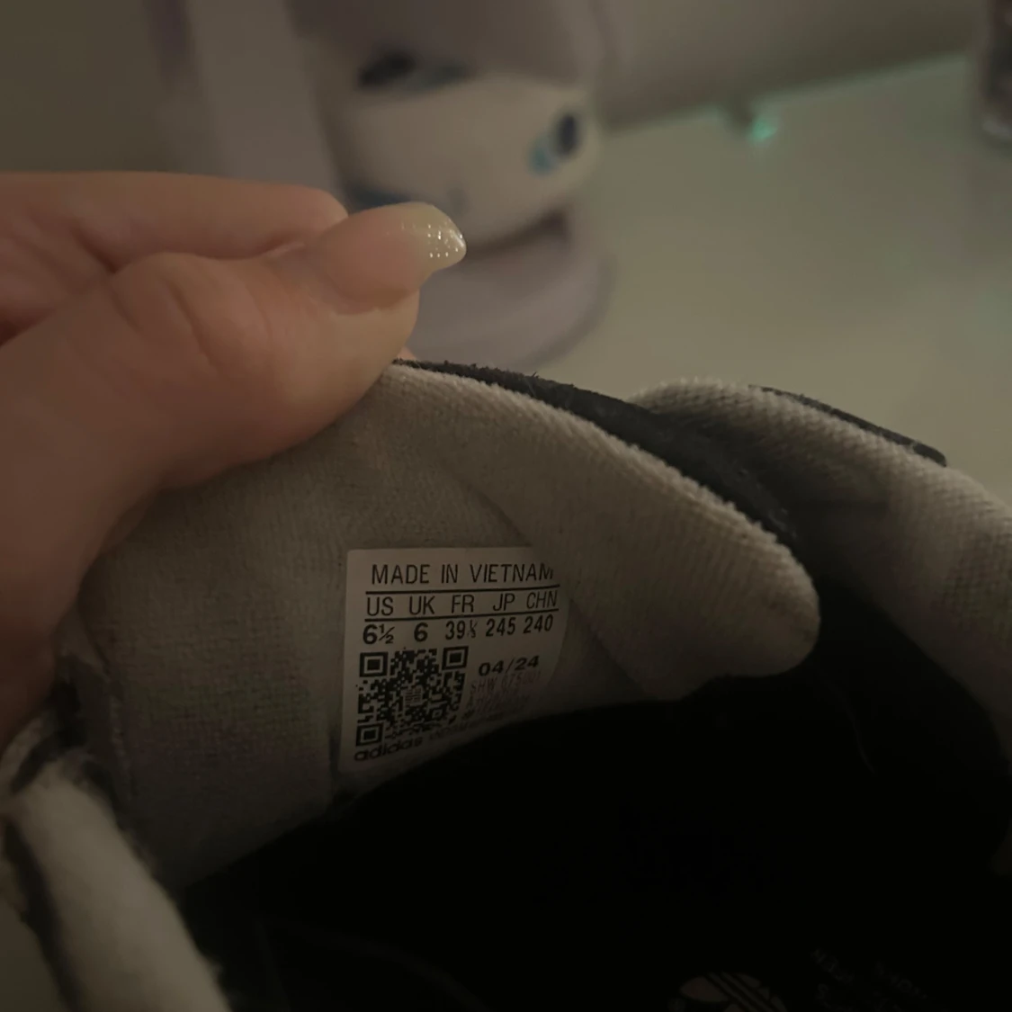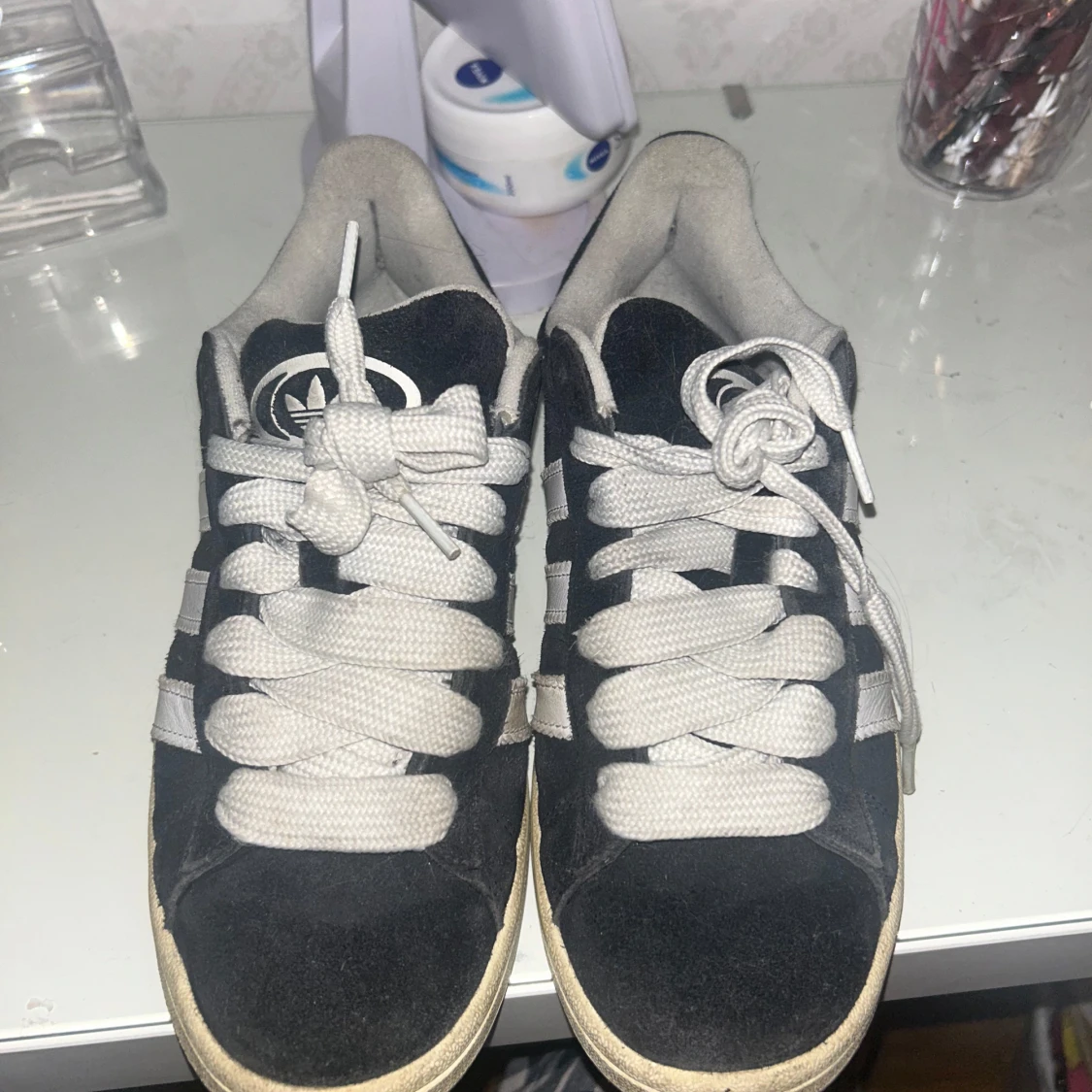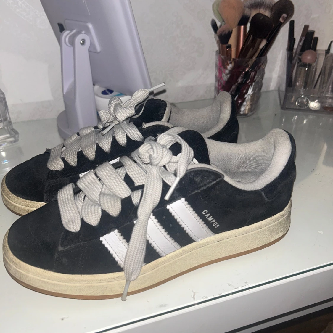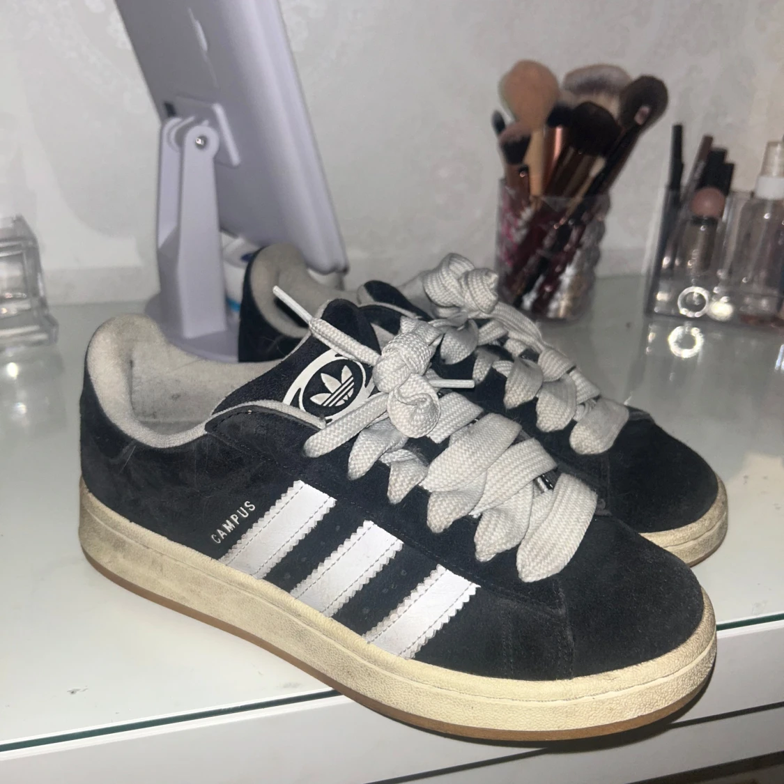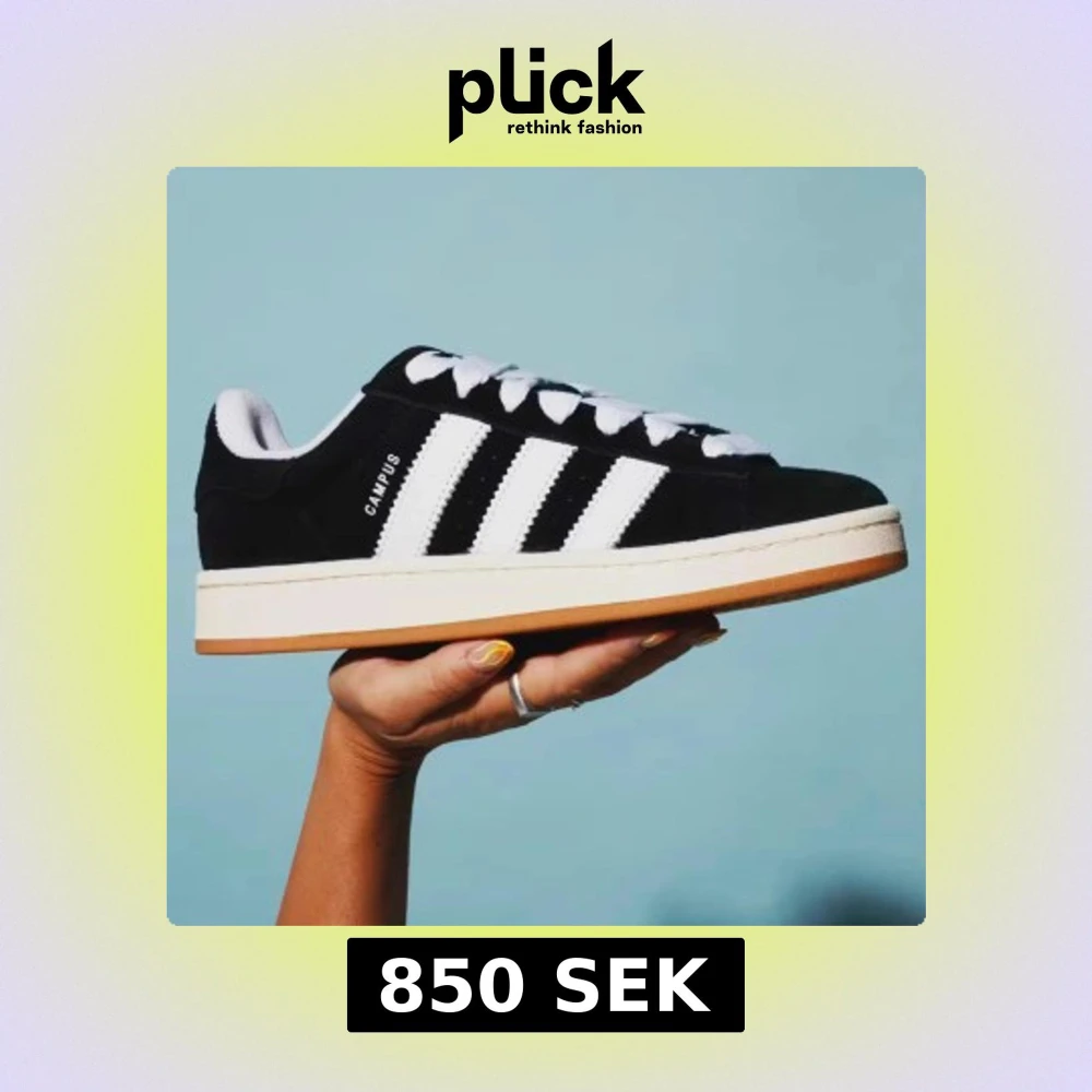Adidas Campus sneakers i svart mocka med vita klassiska ränder på sidorna och vit text. Skorna har tjocka vita snören, rund tå och en beige gummisula. Perfekt för dig som gillar retrostil och vill ha en clean look med street vibe.