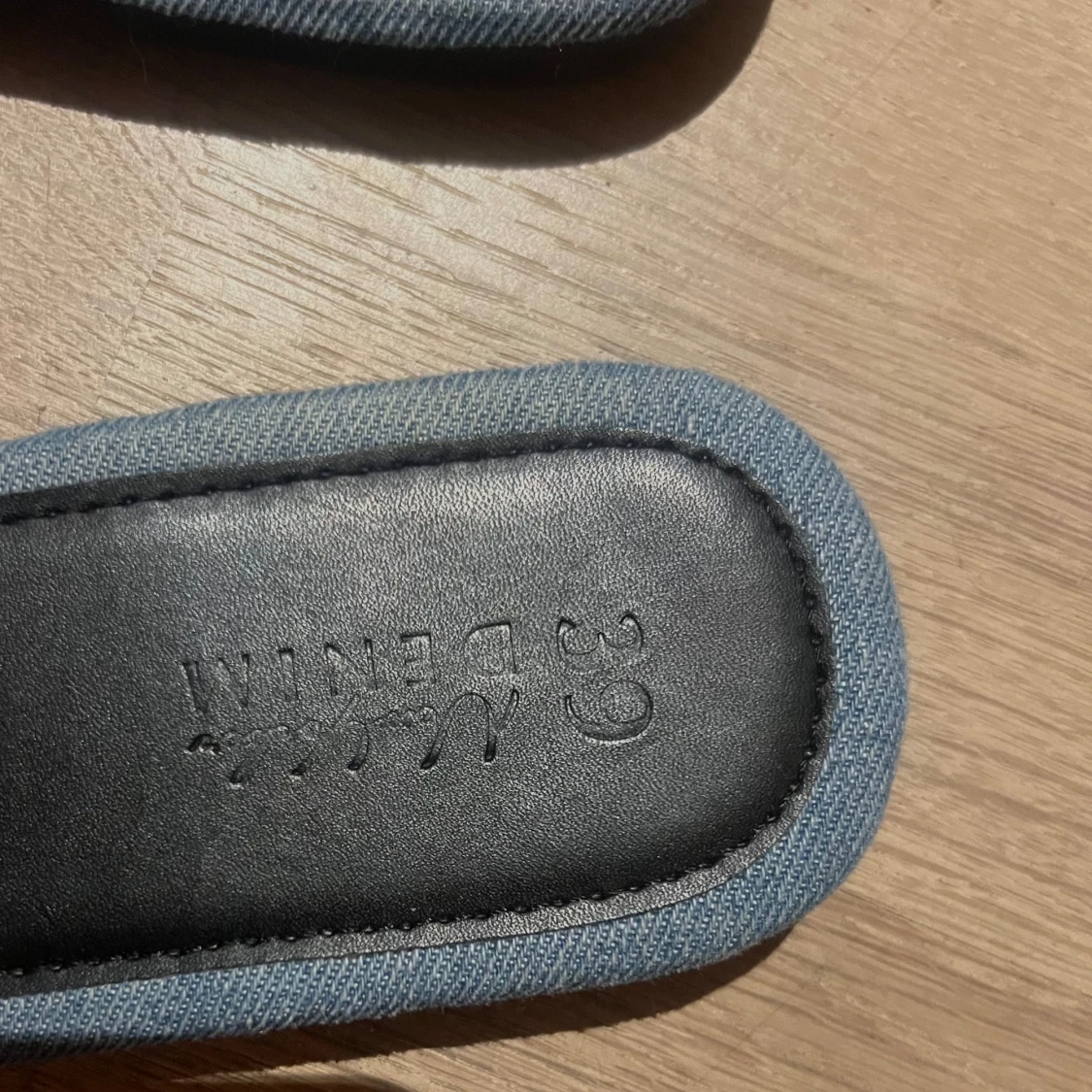 Snygga zara liknande blå sandaler i jeansmaterial. De har en bred rem med nitar och en fyrkantig tå. Perfekt vid alla tillfällen