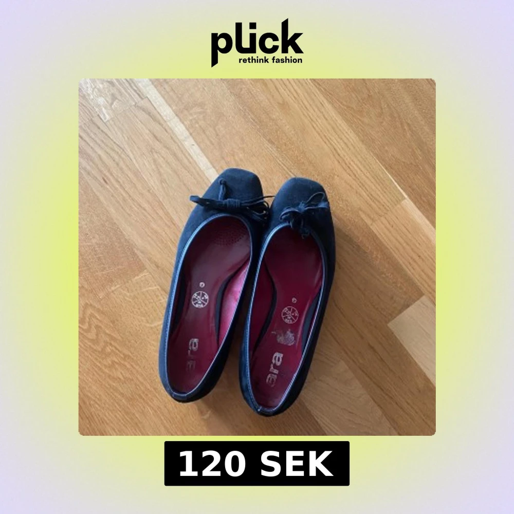 Säljer ett par klassiska svarta ballerinaskor från zara med söt rosettdetalj framtill. Skorna har rund tå, röd innersula och dekorativt blommönster under sulan. Perfekta för dig som gillar stilrena och bekväma skor. Använda men i bra skick!