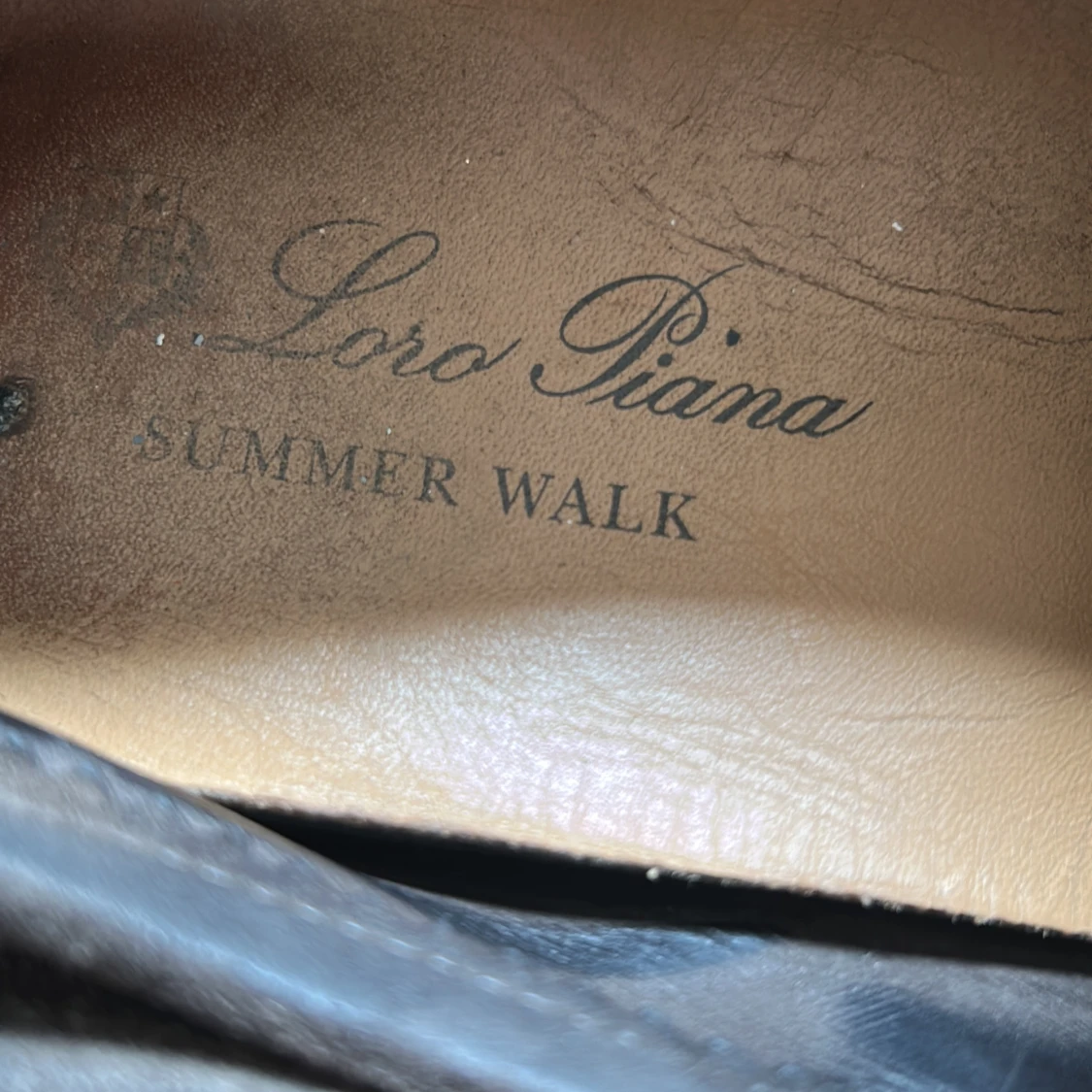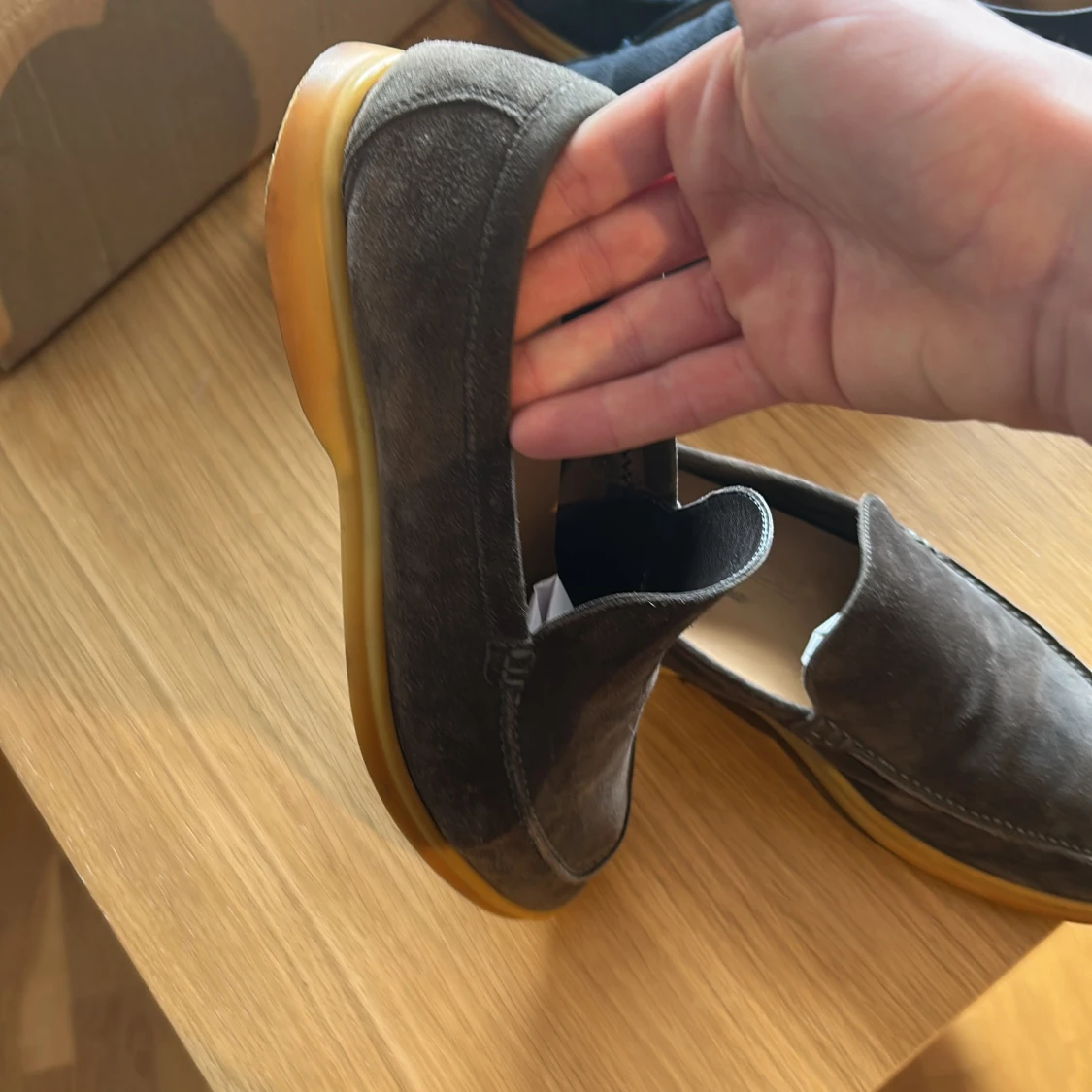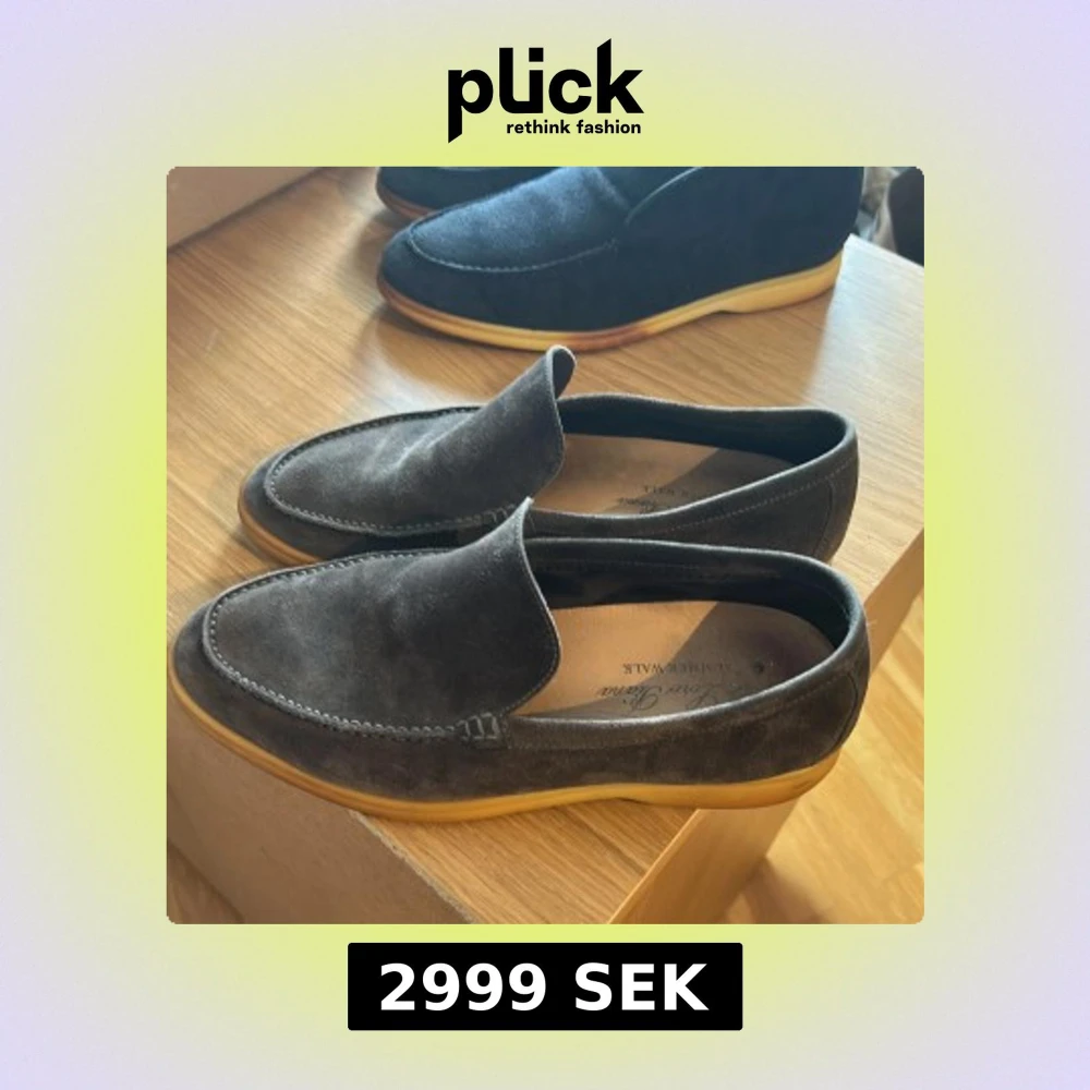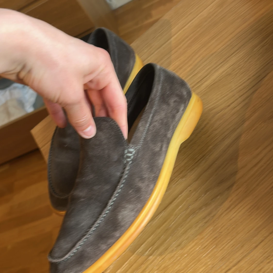 Säljer ett par stilrena mörkbruna loafers från Loro Piana, modellen Summer Walk. Skorna är i mjuk mocka med ljusbruna gummisulor och har en klassisk, rund tå. Perfekta för en avslappnad men elegant look. Är öppen för byten! Det är en liten spricka i sulan! Men funkar ändå!