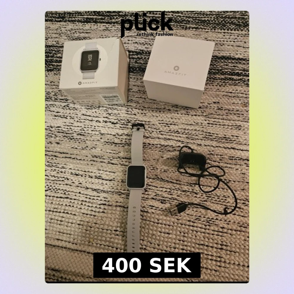Snygg Amazfit smartklocka i grått med fyrkantig display och silikonarmband. Klockan har en stilren design och kommer med originalkartong och laddare. Perfekt för dig som vill ha koll på notiser, träning och hälsa direkt på handleden.