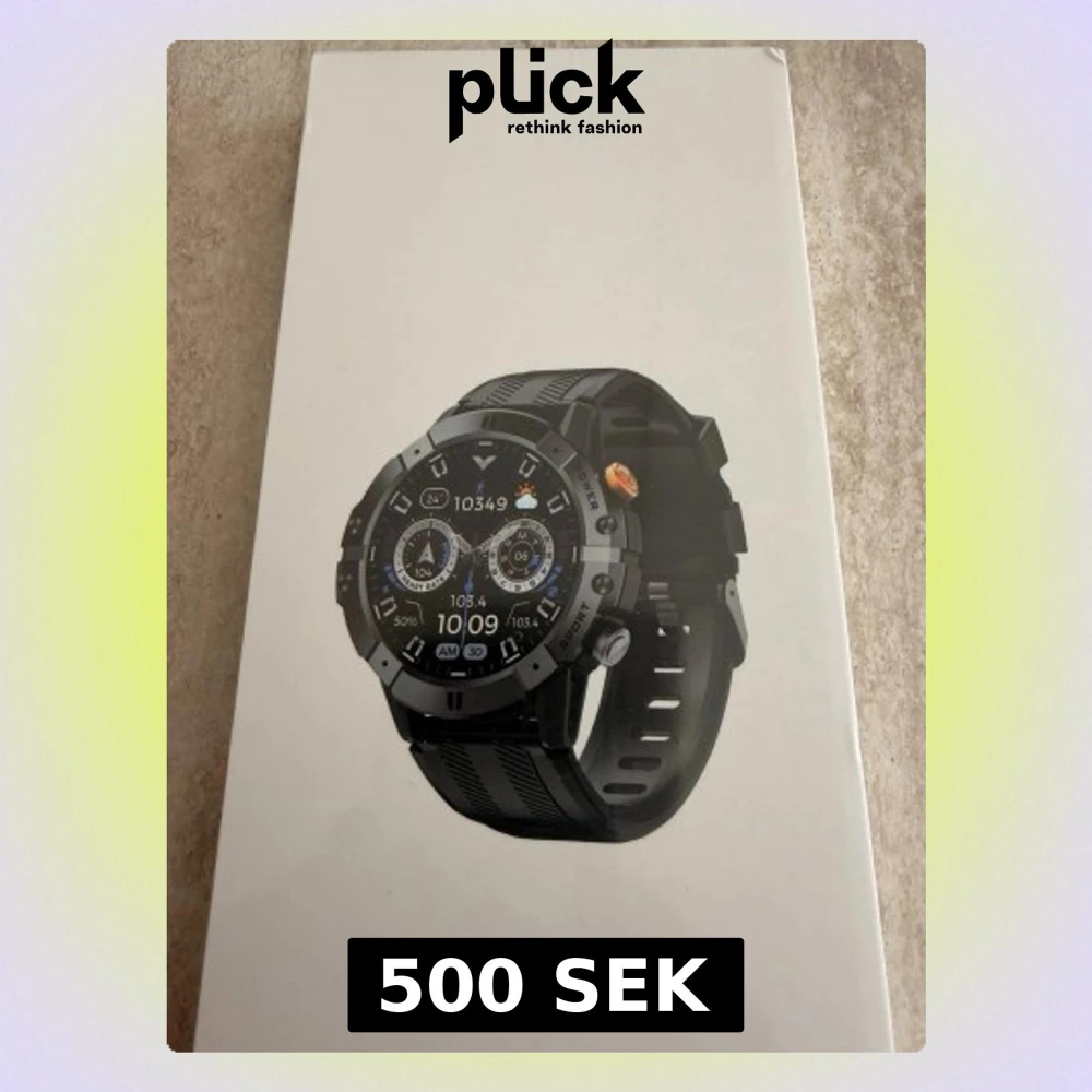 Snygg svart smartklocka med rund urtavla och robust design. Klockan har flera digitala displayer, silikonarmband och metallram. Perfekt för dig som gillar teknik och vill ha koll på både träning och notiser direkt på handleden.