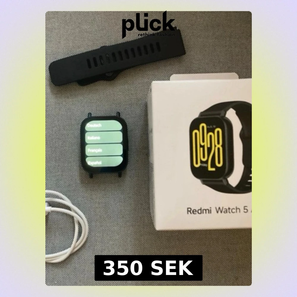 (priset kan diskuteras) Redmi Watch 5 active smartklocka i svart med fyrkantig display och silikonarmband. Klockan har touchskärm, pulsmätare och levereras med laddkabel och originalförpackning. Perfekt för dig som vill ha koll på hälsa och notiser direkt på handleden.