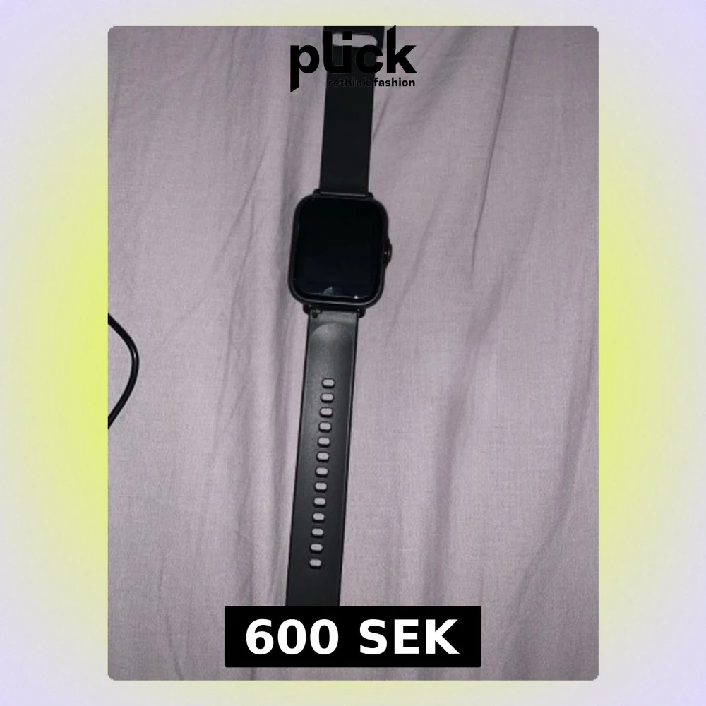 Stilren svart smartklocka med fyrkantig display och mjukt silikonarmband. Klockan har en rund röd knapp på sidan och justerbart spänne för perfekt passform. Passar dig som vill ha koll på notiser och hälsa direkt på handleden.