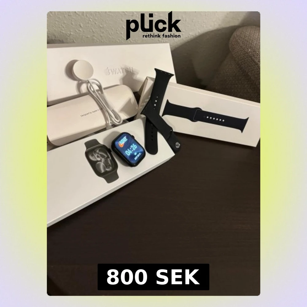 Apple Watch Nike med svart aluminiumboett och svart silikonarmband. Klockan har en fyrkantig form, färgskärm och Nike-logga på urtavlan. Medföljer laddkabel och originalförpackning. Perfekt för dig som gillar sportig design och smarta funktioner.