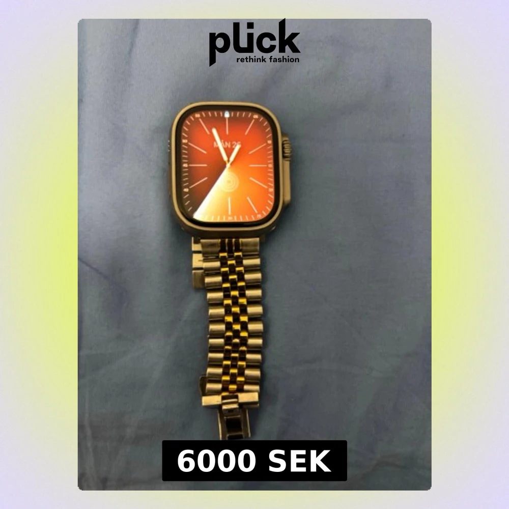 Snygg Apple Watch Ultra med fyrkantig titanboett och orange urtavla. Klockan har ett robust tvåfärgat metallarmband i silver och guldton. Perfekt för dig som vill ha en smartklocka med exklusiv känsla och många funktioner.