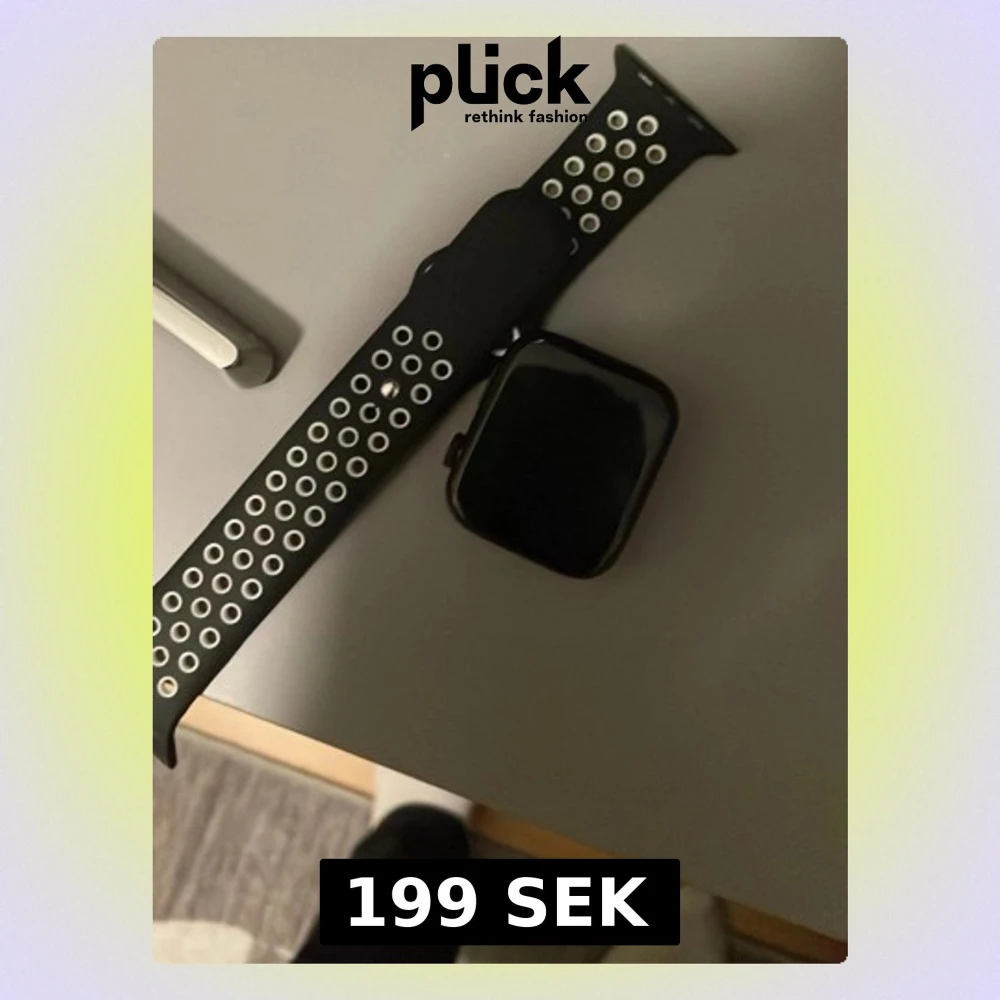 Snygg svart smartklocka med rektangulär skärm och sportigt silikonarmband med vita hål för extra ventilation. Perfekt för dig som gillar teknik och vill ha koll på notiser och träning direkt på handleden.