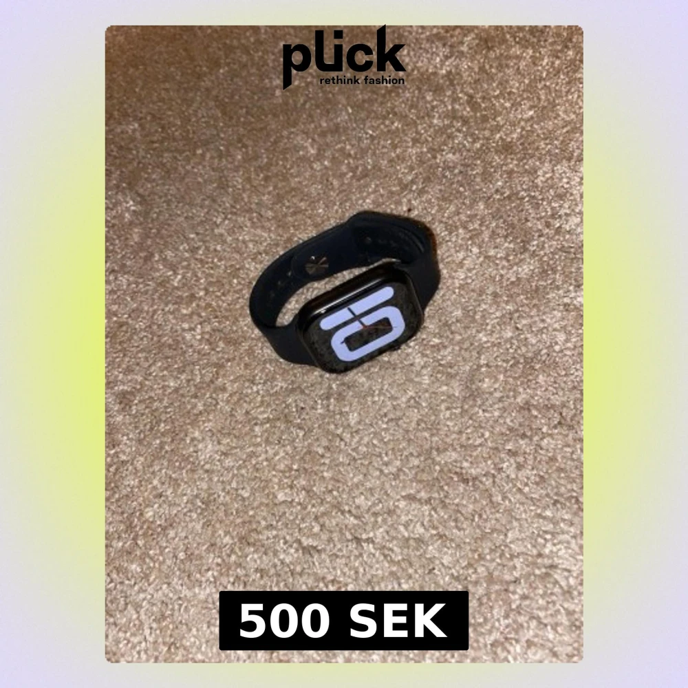 Snygg Apple Watch med svart sportarmband i silikon och rektangulär skärm. Klockan har en modern digital display och stilren design som passar perfekt till vardags. Perfekt för dig som vill ha koll på notiser, träning och hälsa direkt på handleden.