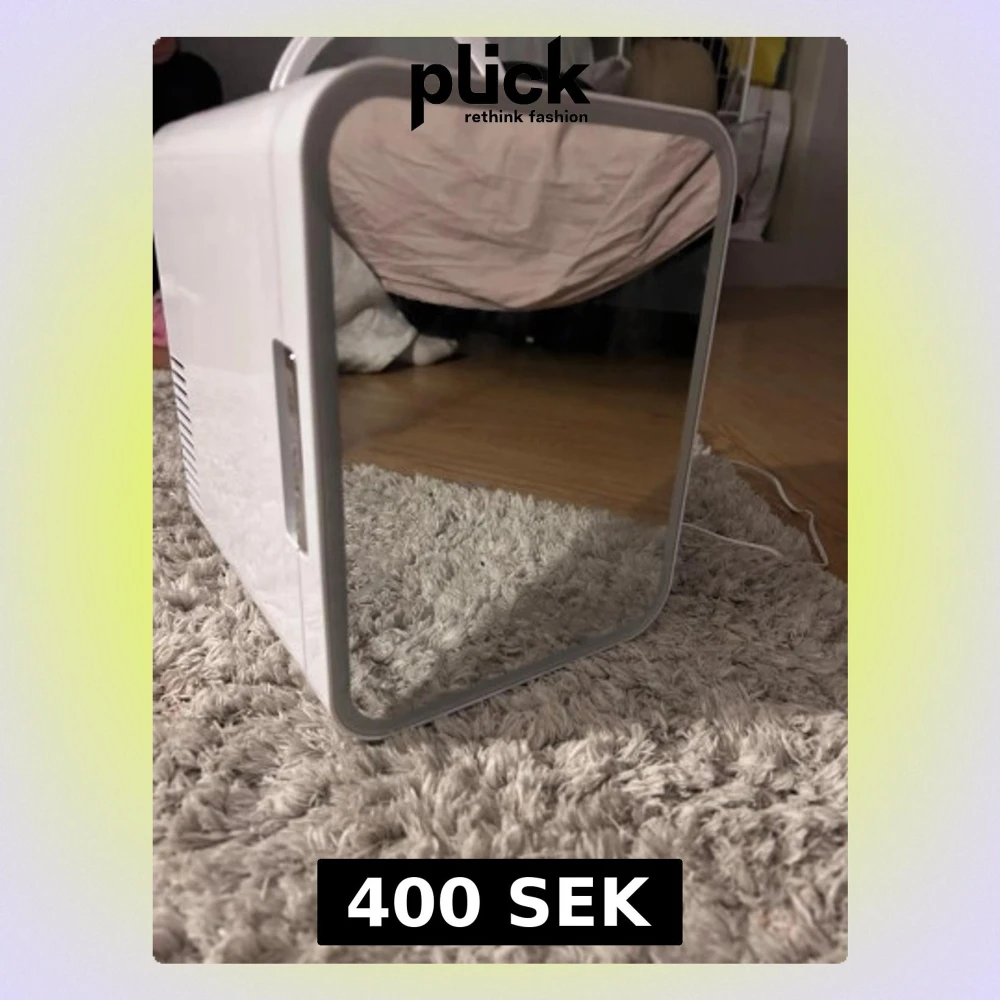 Snyggt och modernt sminkkylskåp i vitt med spegeldörr och praktiskt handtag upptill. Kylskåpet har en hylla och en låda för smart förvaring av hudvård och smink. Tillverkat i plast med spegelyta på dörren, perfekt för ditt sminkbord.