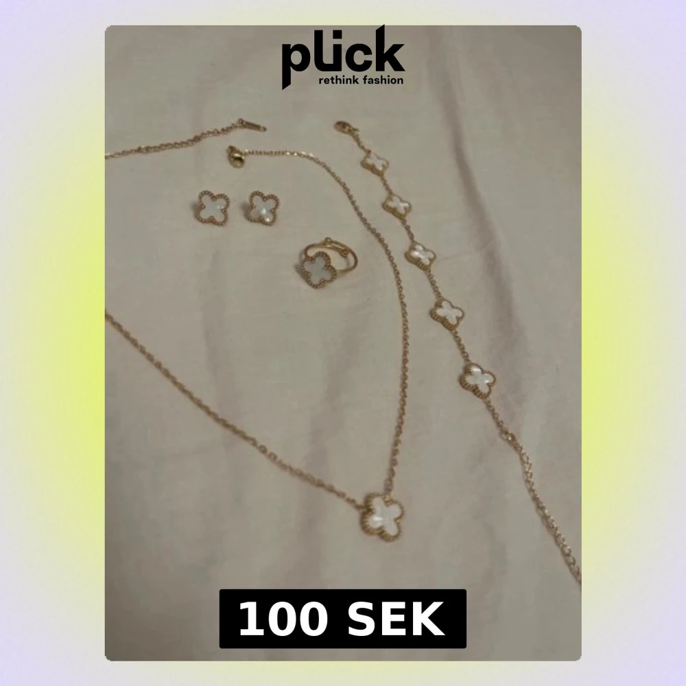 Snyggt smyckeset med halsband, armband, ring och örhängen i guldplätering. Alla delar har vita fyrklöverformade hängen med pärlliknande kant. Perfekt för dig som gillar eleganta och trendiga accessoarer.