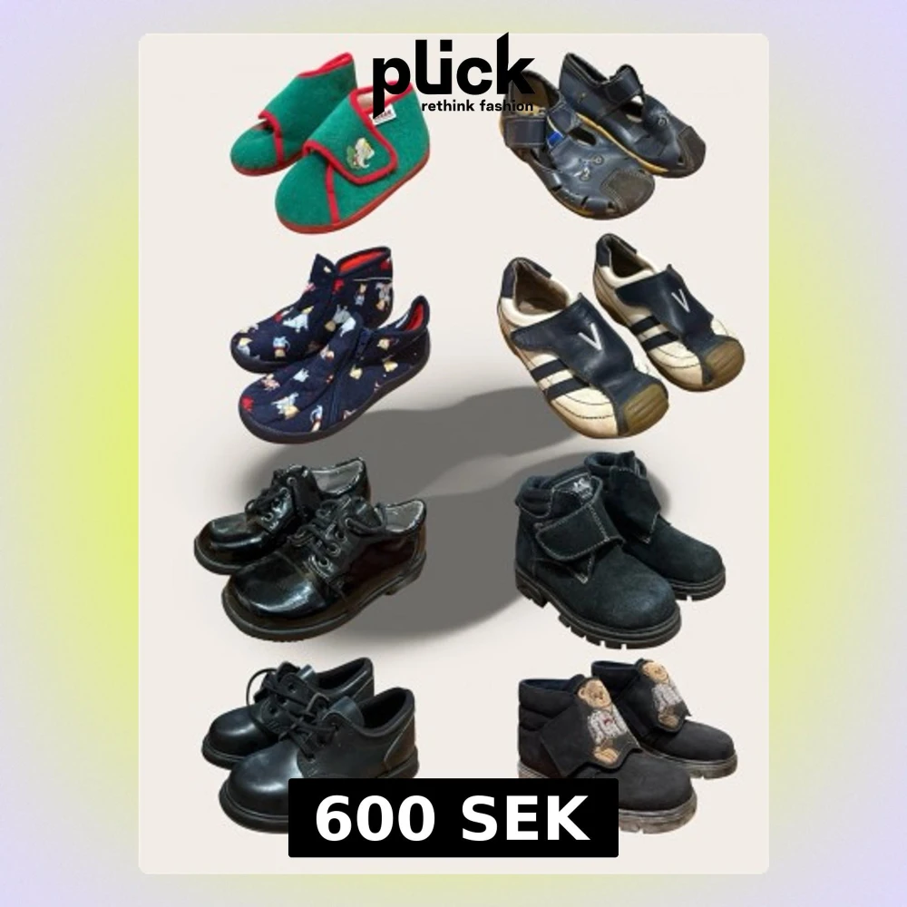 Säljer ett rejält paket med kvalitetsskor för barn i olika storlekar och för olika tillfällen. Från festliga kostymskor till mjuka tofflor och rejäla kängor. Paketet innehåller: Storlek 24: Bonnie & Clyde kostymskor, svarta. Storlek 25 (uppskattad): Laimeng kängor, svarta. Storlek 25: Kavat kostymskor, svarta. Storlek 25: Micio kängor med nalle-detalj. Storlek 26: Babar tofflor, gröna med röd kant. Storlek 26: Vincent sneakers, blå/vita. Storlek 26: Kavat sandaler, blå med motorcykel-des