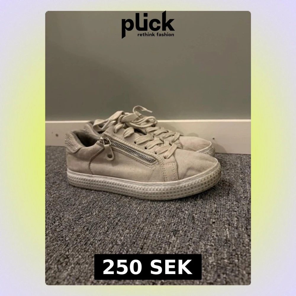 Stilrena beige sneakers i mockaimitation med snörning och en snygg silverfärgad dragkedja på sidan. Skorna har en vit, räfflad sula och diskreta detaljer vid hälen. Perfekta för en avslappnad och trendig look.