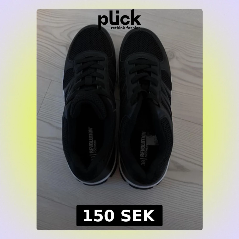 Snygga svarta sneakers från Revolution med mesh-ovandel och klassisk snörning. Skorna har en sportig look med vita detaljer på sulan och är perfekta för en avslappnad streetstyle. Lätta och bekväma att bära hela dagen. Använda en gång!