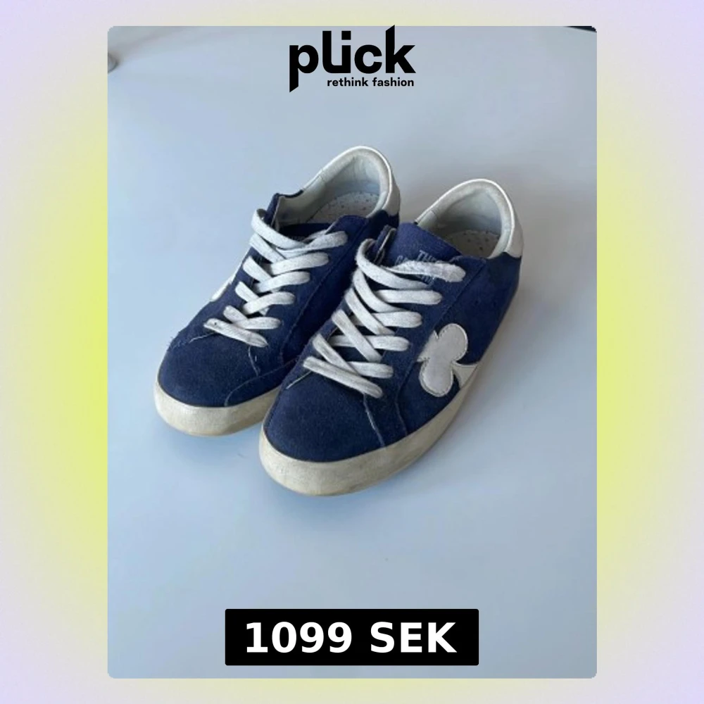Snygga blå sneakers från The Galleryist med vit sula och vita detaljer. Skorna har en unik klöverdetalj på sidan och är gjorda i mockaliknande material. Klassisk låg modell med vita skosnören och bekväm innersula med tryckt text.