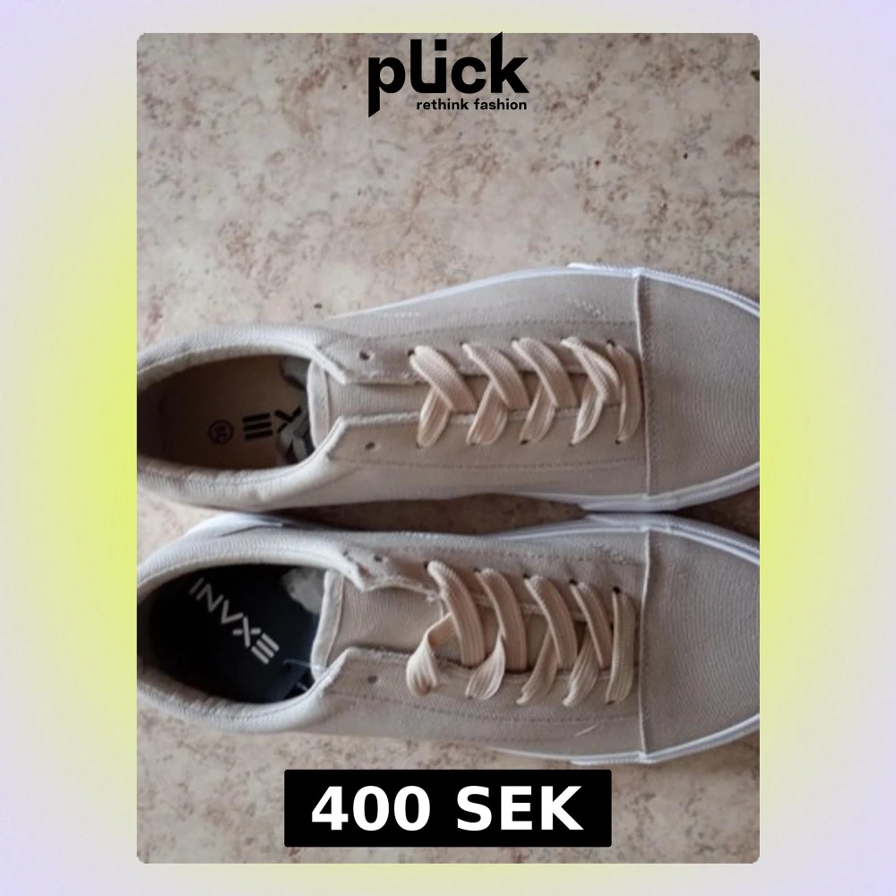 Snygga beige sneakers från EXANI i canvasmaterial med vita gummisulor och klassisk snörning. Skorna har en låg profil och bruna yttersulor med rutmönster för bra grepp. Perfekta för en avslappnad och trendig stil. Stl 39 damskor