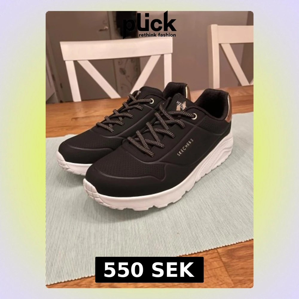 Svarta sneakers från Skechers med chunky vit sula och detaljer i guld vid hälen. Skorna har perforerad ovandel, svarta och vita snören samt Skechers-logga på sidan. Perfekta för en sportig och stilren look.