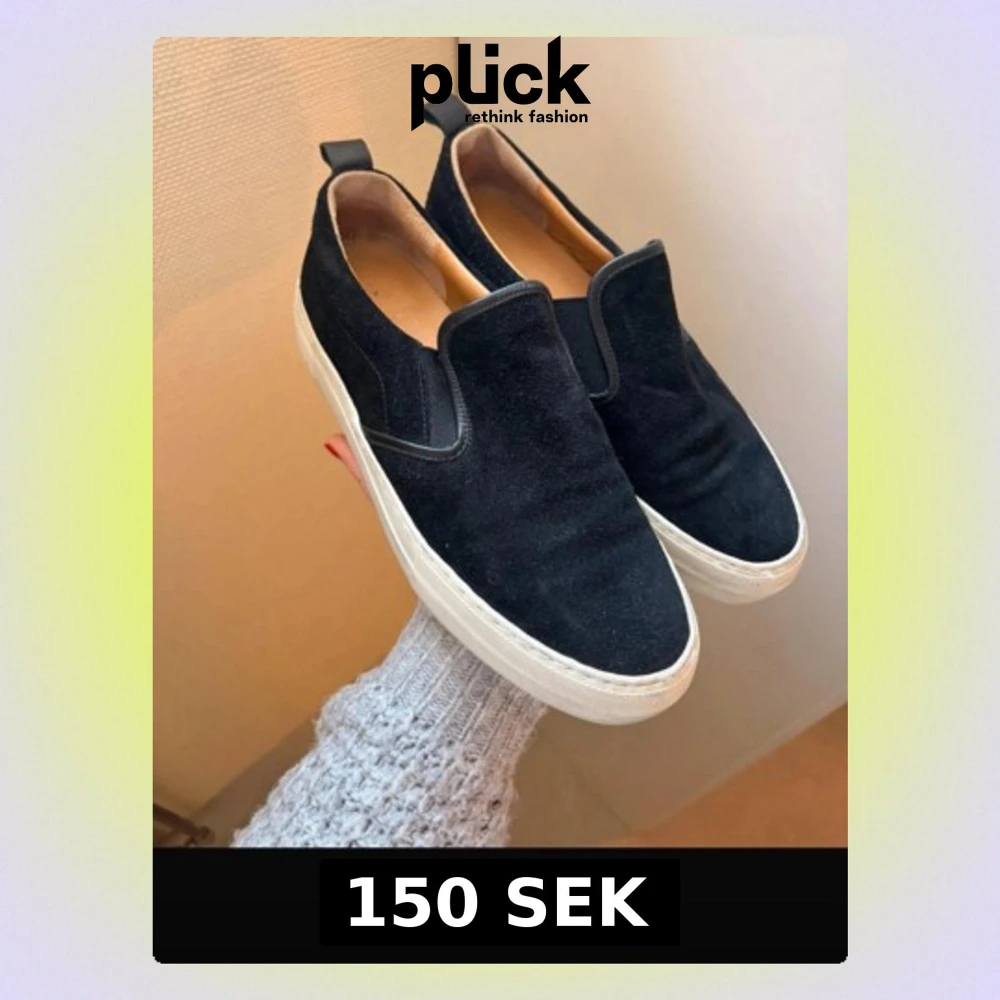 Stilrena svarta slip-on sneakers i mocka med skinndetaljer, vit sula och elastiska paneler på sidorna. Skorna har en enkel och clean design med dragflikar bak för enkel påtagning. Sparsamt använda men väldigt bekväma tack vare ortopedisk sula i läder. Angiven storlek är 38 men dem passar snarare en 39a.