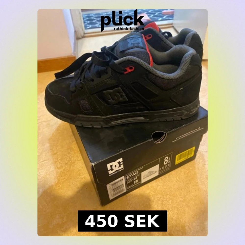 Säljer ett par svarta DC Stag sneakers med grå och röda detaljer. Skorna har en chunky sula, vadderad plös och krage samt DC-logga på sidan. Materialet är en mix av mocka och mesh för extra komfort och stil.