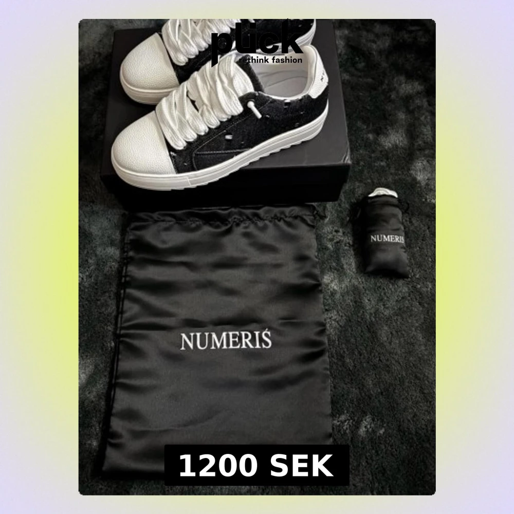 Säljer ett par stilrena sneakers från Numeris i svart och vitt. Skorna har en chunky vit sula, grova vita skosnören och ovandel i svart tyg med slitna detaljer. Tå och häl är i vitt läderliknande material. Kommer med dustbag och förpackning.
