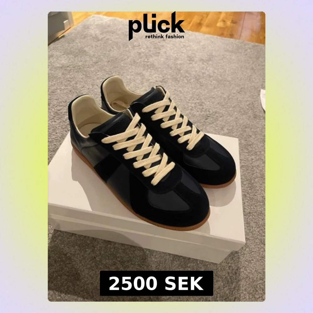 Mörkblåa sneakers med vita snören och brun sula. Skorna har en klassisk låg profil och är tillverkade i en mix av mocka och läder. Insidan är ljus och de har en stilren design som passar till det mesta. Helt nya, inte använda.