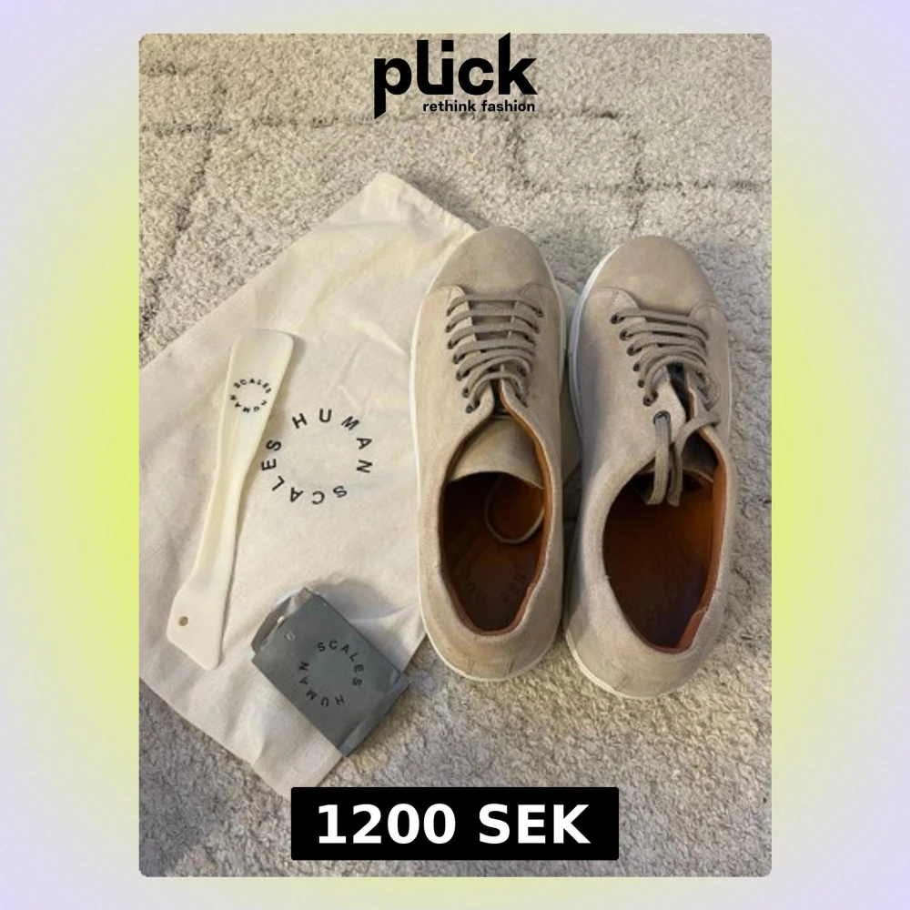 Helt nya beige sneakers i mocka från Human Scales med vita sulor och klassisk låg profil i storlek 44. Skorna har matchande beige skosnören, metallöljetter och brunt innerfoder i läder. Perfekta för en clean och stilren look. Nypris 1900kr.