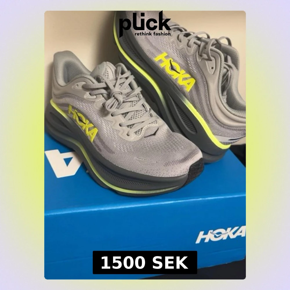 Snygga grå sneakers från Hoka med neongula loggor och detaljer. Ovandelen är i mesh för bra andningsförmåga och sulan är tjock och svart med limegrön kant. Perfekta för dig som gillar sportig stil och vill ha bekväma skor till vardags.
