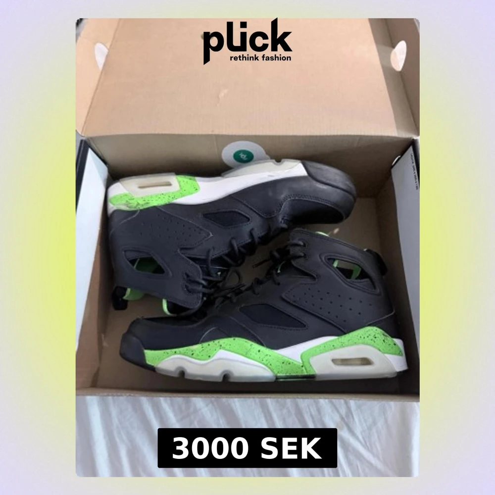 Snygga Air Jordan sneakers i svart läder med limegröna detaljer och vit sula. Skorna har högt skaft, klassisk snörning och ventilerande meshpaneler. Perfekta för dig som vill sticka ut med en sportig och trendig look.
