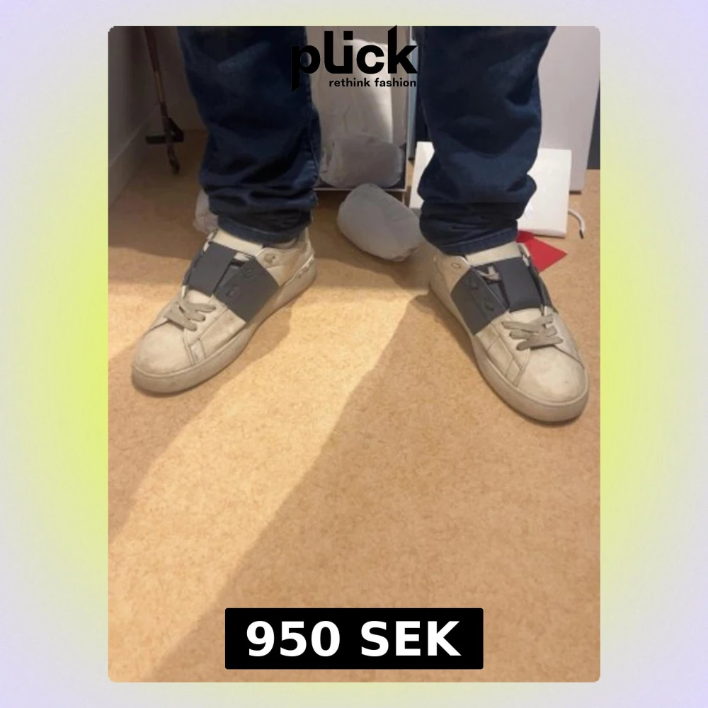 Säljer ett par vita sneakers från Valentino med bred grå rem över vristen och klassisk snörning. Skorna har en låg profil och är tillverkade i läder med subtila nitar på hälen. Perfekta för dig som gillar stilrena och exklusiva sneakers.