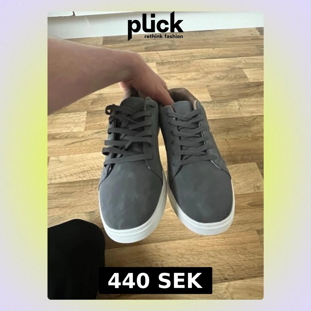 Snygga grå sneakers med klassisk låg profil och vit sula. Skorna har matchande grå skosnören och en stilren design utan synliga loggor. Materialet ser ut att vara slätt syntet eller mockaimitation, vilket ger en modern look.