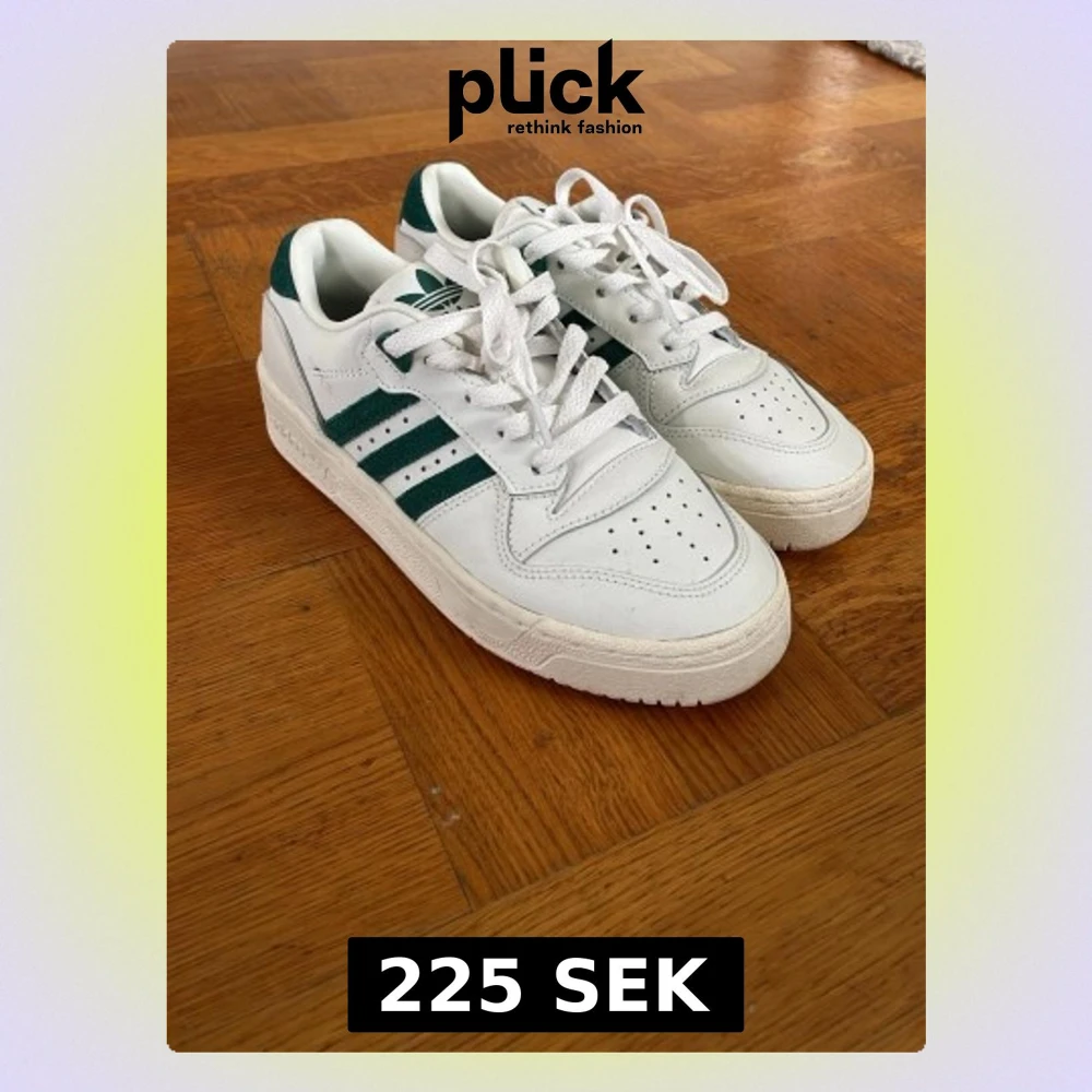 Snygga vita sneakers från Adidas med klassiska gröna ränder på sidorna och matchande grönt på hälen. Skorna har perforerade detaljer på tån och är gjorda i läder med vit sula. Perfekta för en sportig och stilren look.