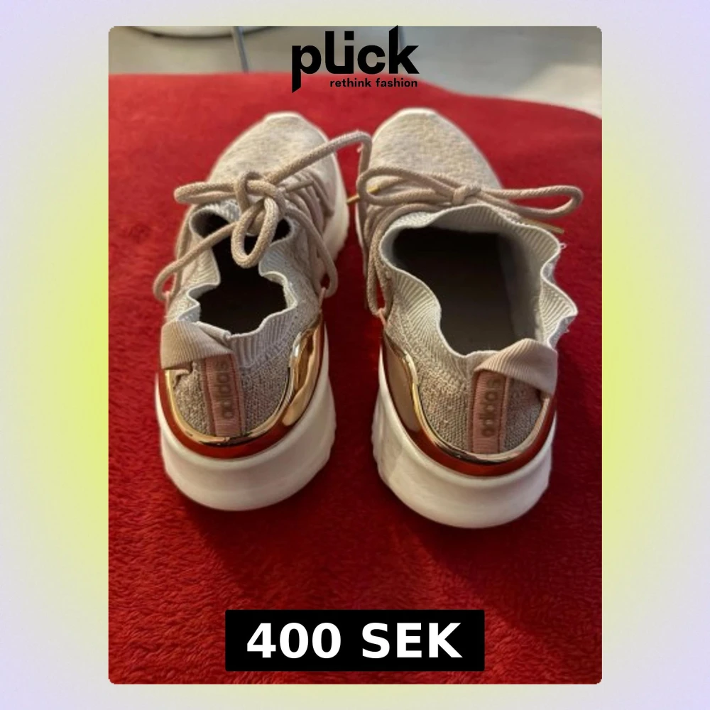 Stilrena sneakers från Adidas i beige stickad textil med vita sulor och snygga gulddetaljer vid hälen. Skorna har elastiska snören och en modern, vågig kant runt öppningen. Perfekta för dig som gillar sportig och trendig stil.
