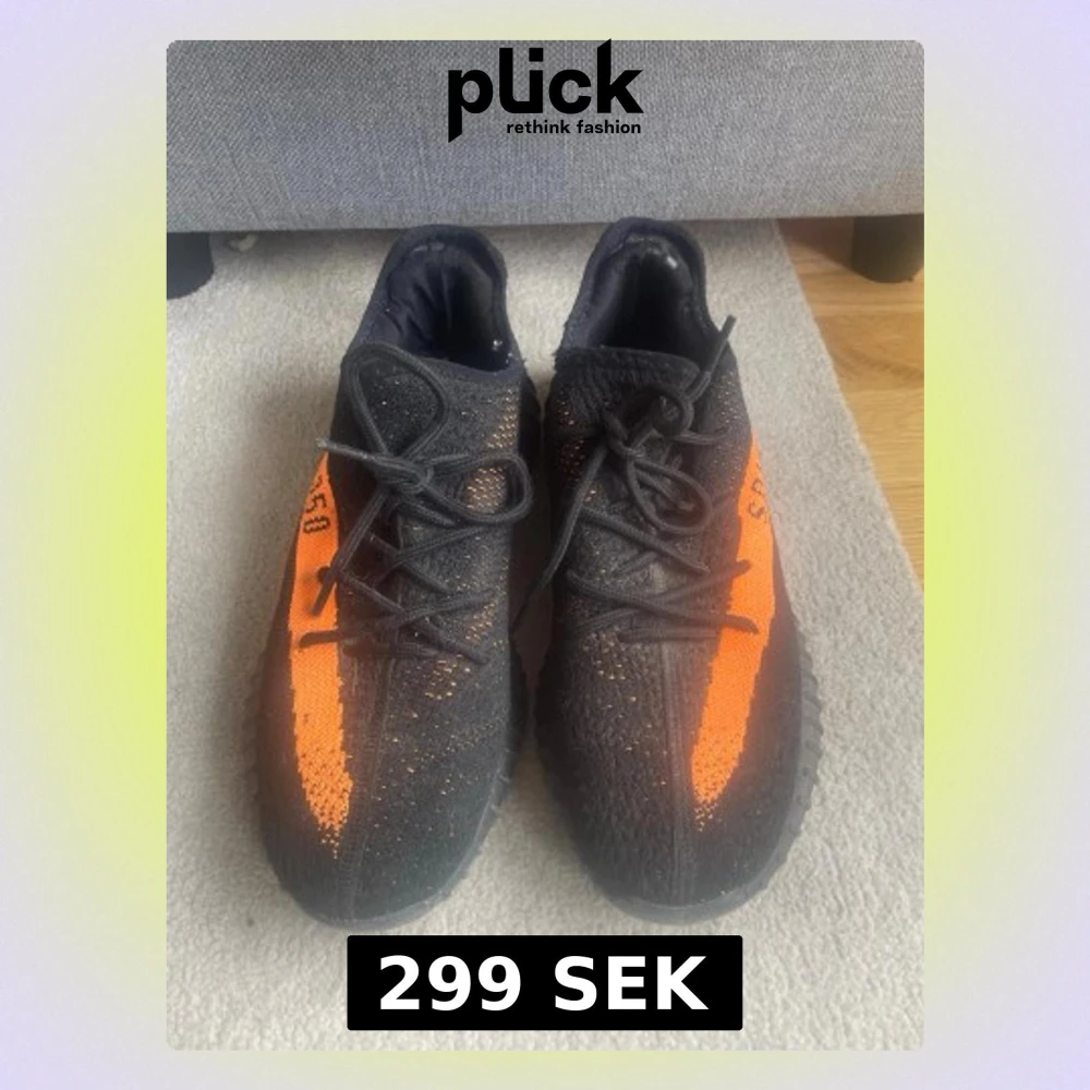 Säljer ett par Yeezy Boost 350 V2 med svart Primeknit-överdel och en fet orange stripe med texten 'SPLY-350' på sidan. Skorna har en chunky sula och klassiska svarta skosnören. Perfekta för dig som vill sticka ut med en ikonisk sneaker.