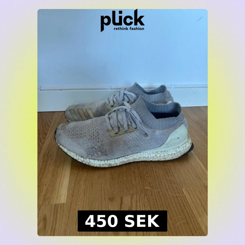 Grå Adidas Ultra Boost sneakers med stickad ovandel och vita Boost-sulor. Skorna har lågt skaft, snörning och en strumpliknande passform. Diskreta detaljer i beige och svart på sulan. Perfekta för dig som gillar sportig och clean stil.