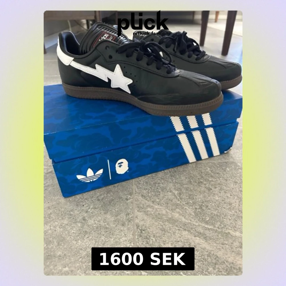 Unika sneakers från Adidas och Bape i svart och vitt med klassiska Bape-stjärnan på sidan och Adidas ränder på andra sidan. Lågt skaft, svart ovandel i läder och brun sula. Perfekta för dig som gillar streetwear och limited edition samarbeten. Sprillans nya.