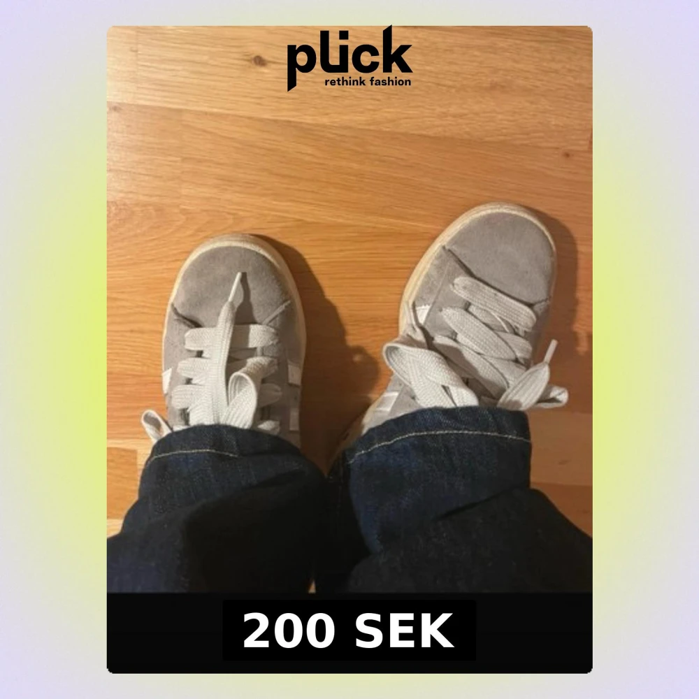Snygga grå sneakers från Adidas i mocka med klassiska vita ränder på sidorna och vit sula. Skorna har breda vita skosnören och låg profil, perfekt för en avslappnad streetstil.