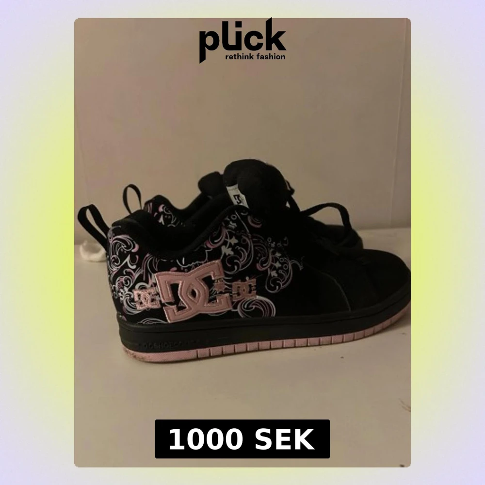 Säljer ett par svarta DC Shoes sneakers med stora rosa loggor på sidan och coola mönster i vitt och rosa. Skorna har tjock plös, svarta skosnören och rosa sula. Perfekta för dig som gillar streetwear och vill sticka ut lite extra.