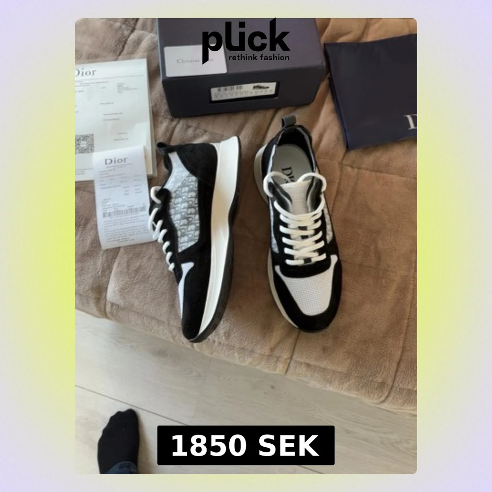 Snygga svartvita sneakers från Dior med klassisk logga på sidan, meshdetaljer och mockaliknande partier. Tjock vit sula med svarta gummiprickar undertill och vita skosnören. Perfekta för dig som vill ha en exklusiv och trendig look.