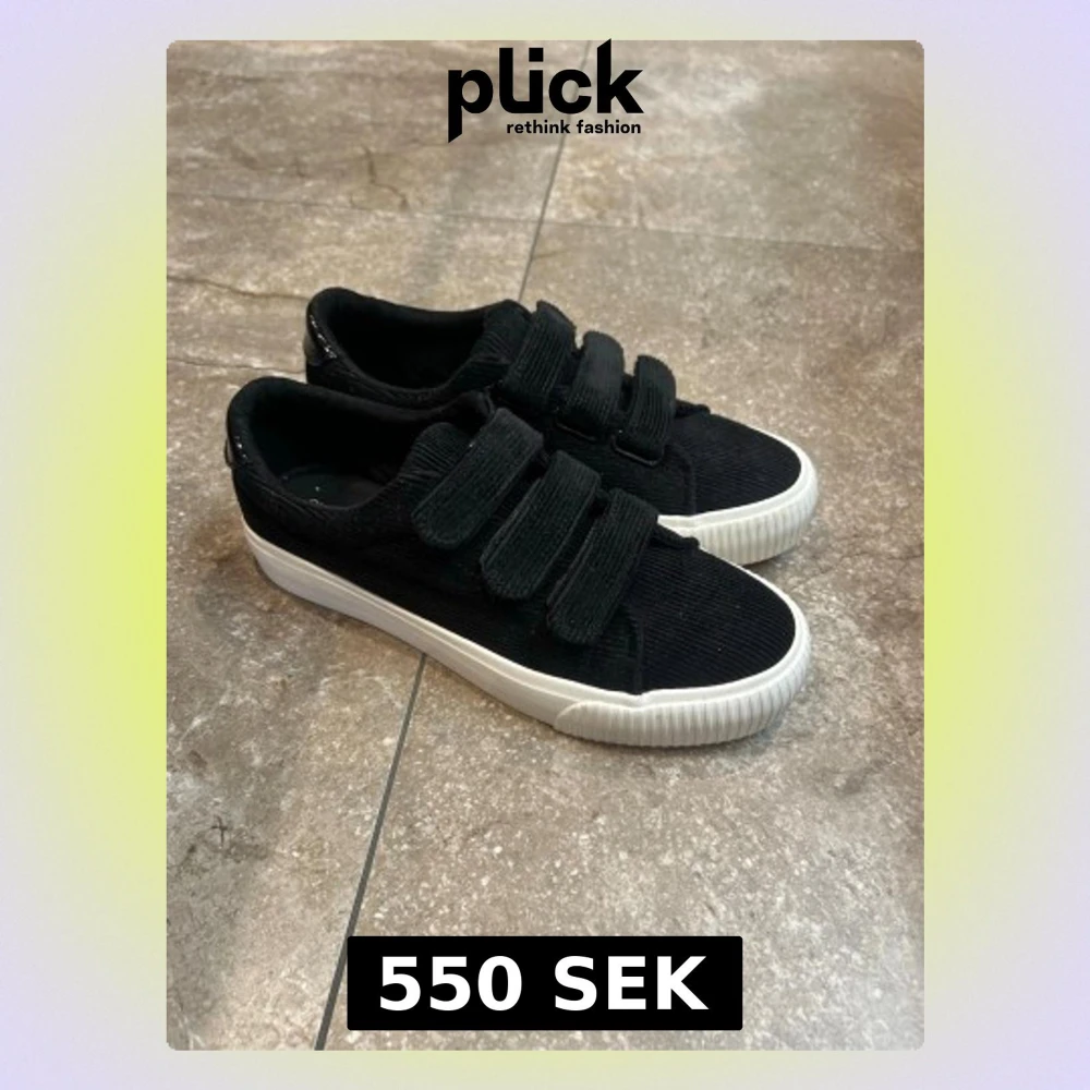 Slutsålda!!! Helt nya endast använda. Stilrena svarta sneakers med tre breda kardborreband och vit sula. Ovandelen är i manchestertyg som ger en cool textur. Perfekta för dig som vill ha en enkel men trendig look.