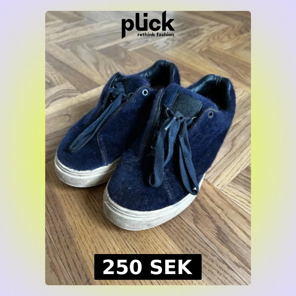 Unika mörkblå sneakers från Eytys med pälsliknande material på ovandelen, svarta skosnören och vit sula. Skorna har en låg profil och en chunky känsla, perfekt för dig som vill sticka ut med din stil.