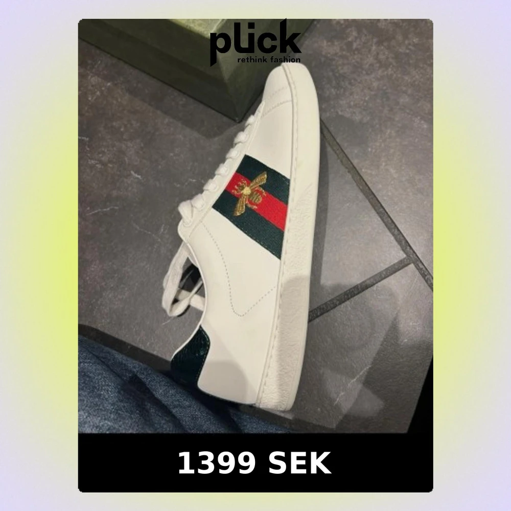 Stilrena vita sneakers från Gucci med klassiska gröna och röda ränder på sidan samt en broderad guldfärgad bi. Skon har vit sula med unikt mönster undertill och detaljer i mörkgrönt vid hälen. Tillverkad i läder.